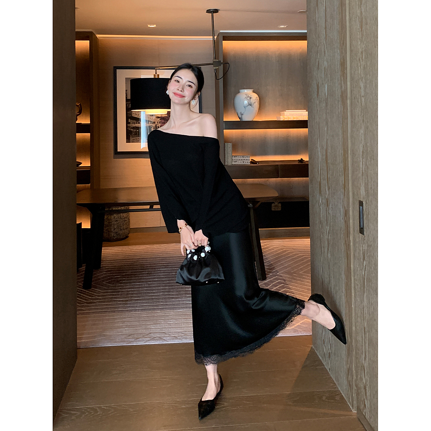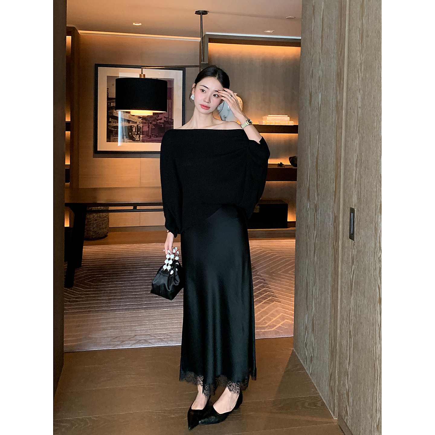 Maven Lin低调奢华 黑色拼接蕾丝醋酸半身裙女气质垂感哑光鱼尾裙