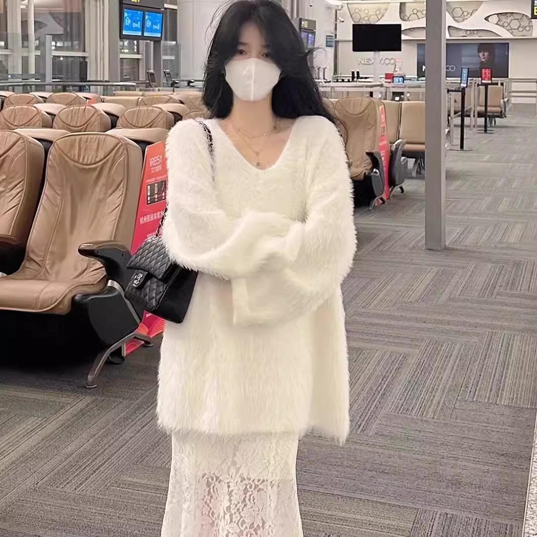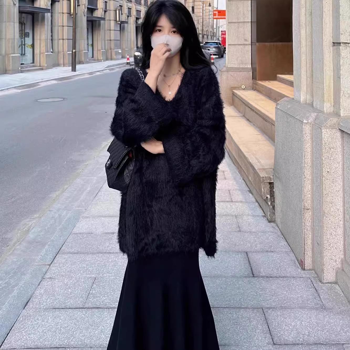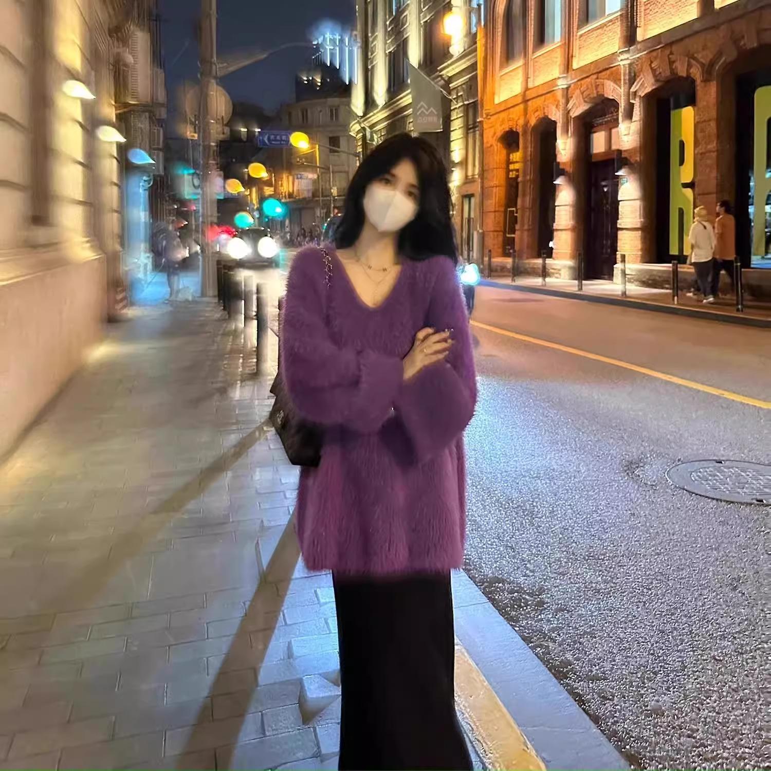 秋冬V领宽松慵懒风毛衣加厚仿水貂毛外套女紫色法式洋气韩版上衣