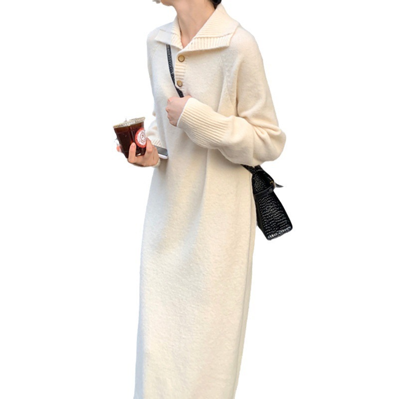韩版新款女式毛衣时尚针织连衣裙纽扣翻领宽松长款内搭套头毛衣