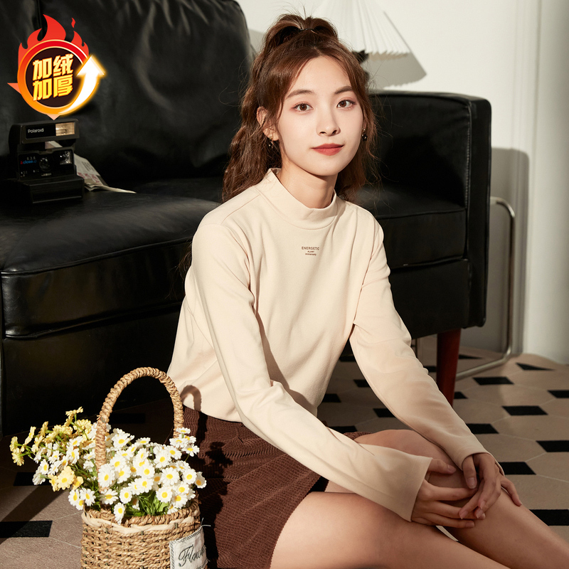 唐狮半高领打底衫女秋冬新正肩加绒设计感别致内搭修身长袖上衣