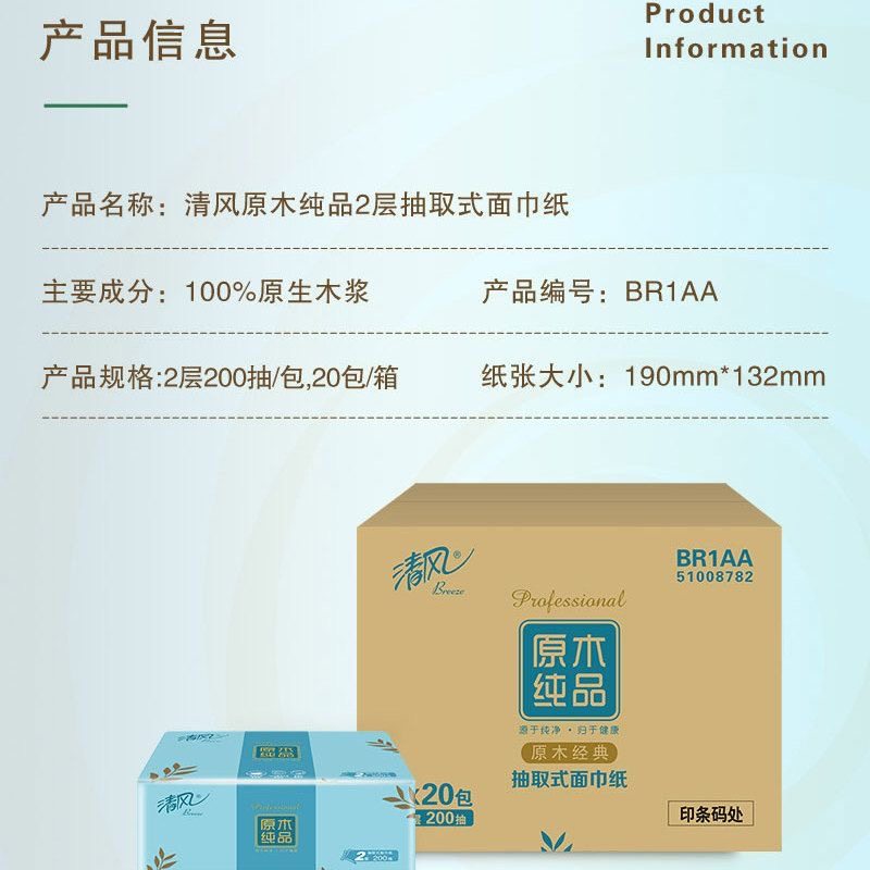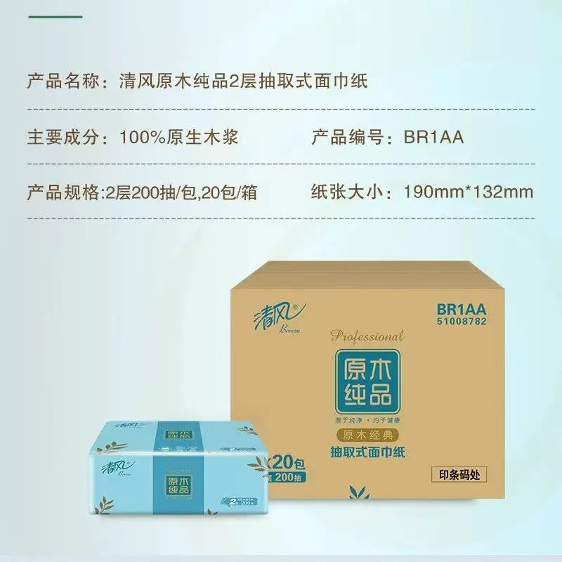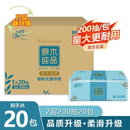 清风抽纸淡绿花2层200抽20包原木抽纸软包面纸家用整箱包邮