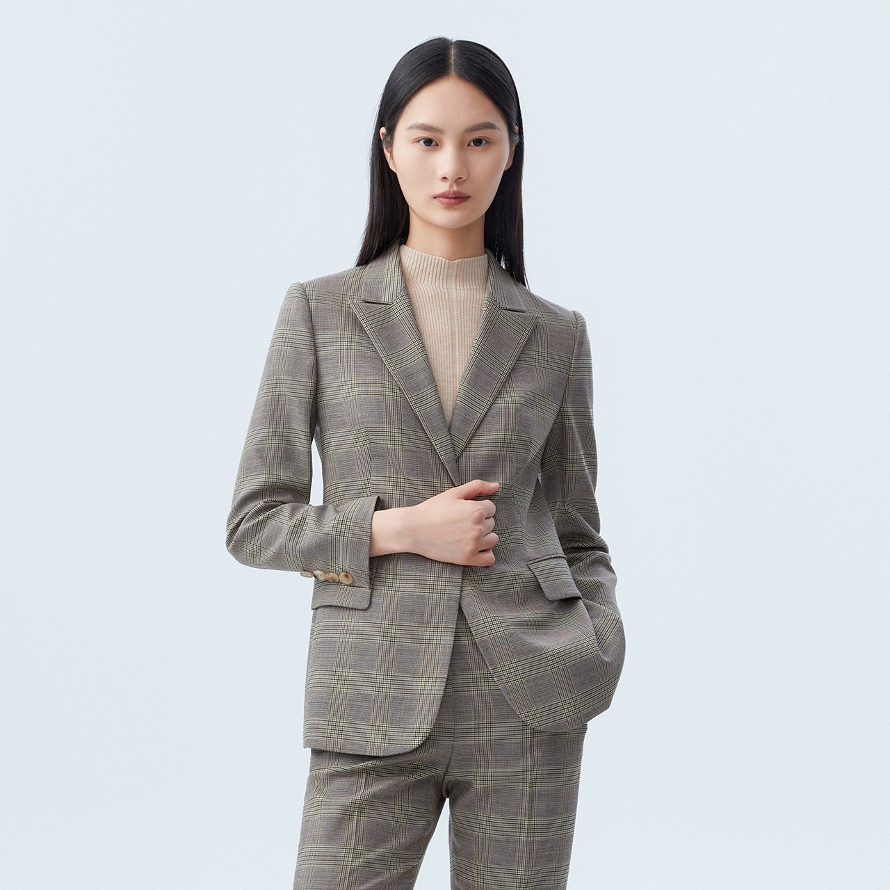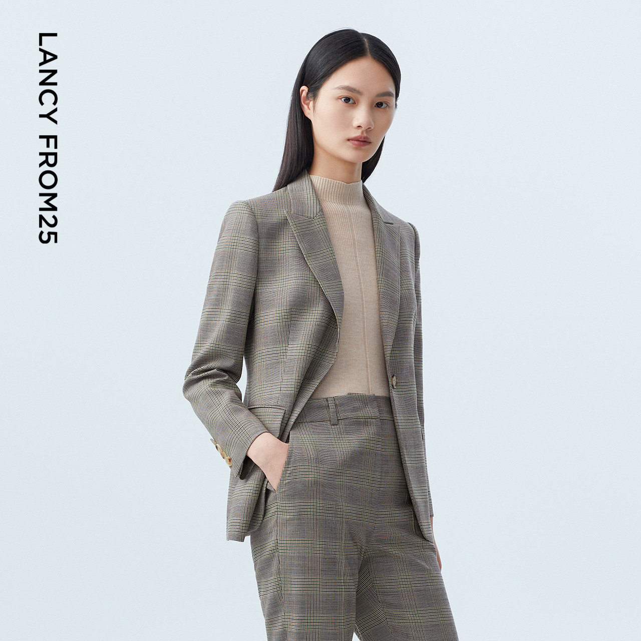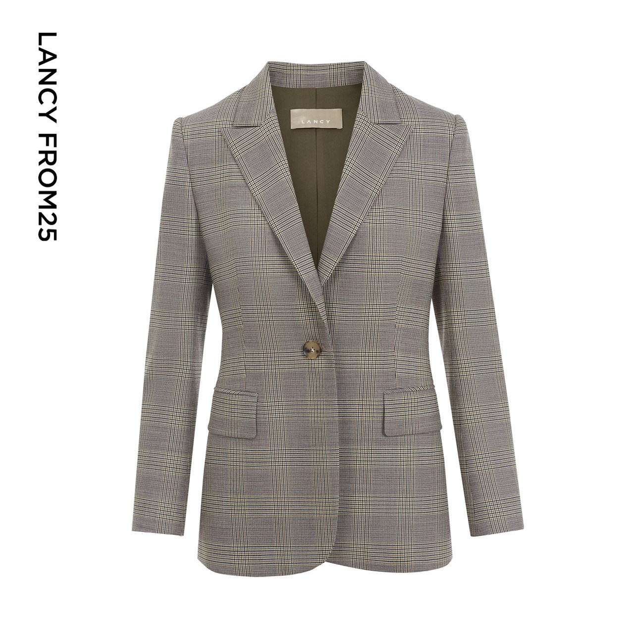 LANCY/朗姿女装2023秋季新款羊毛西装外套女格纹通勤职业西服上衣
