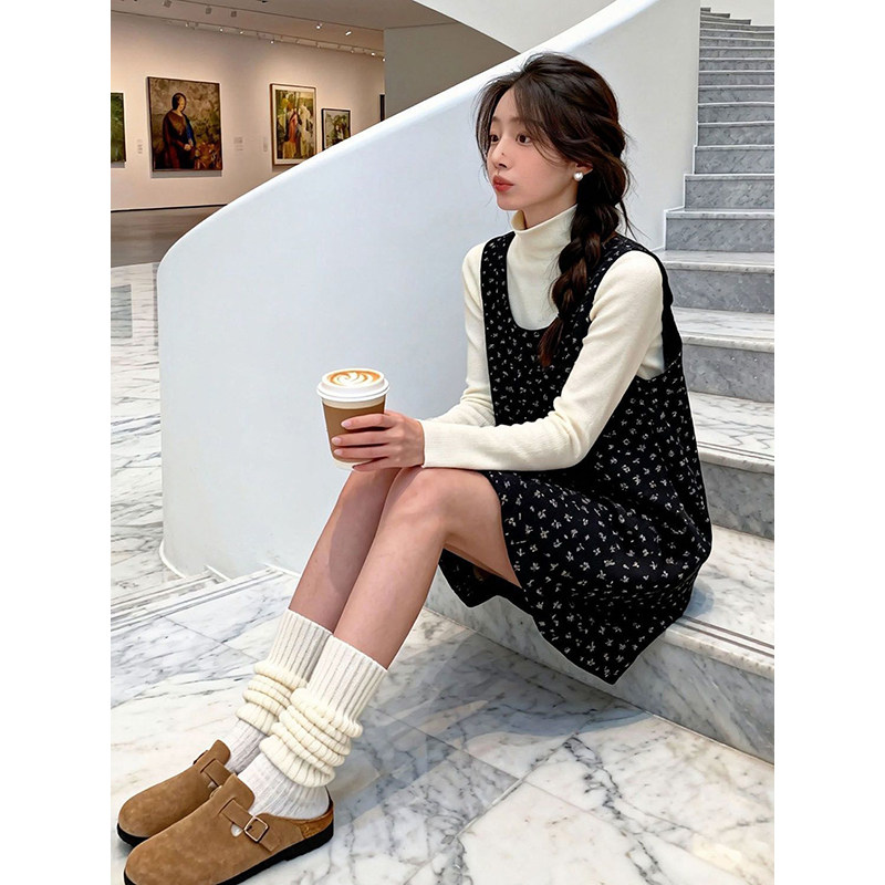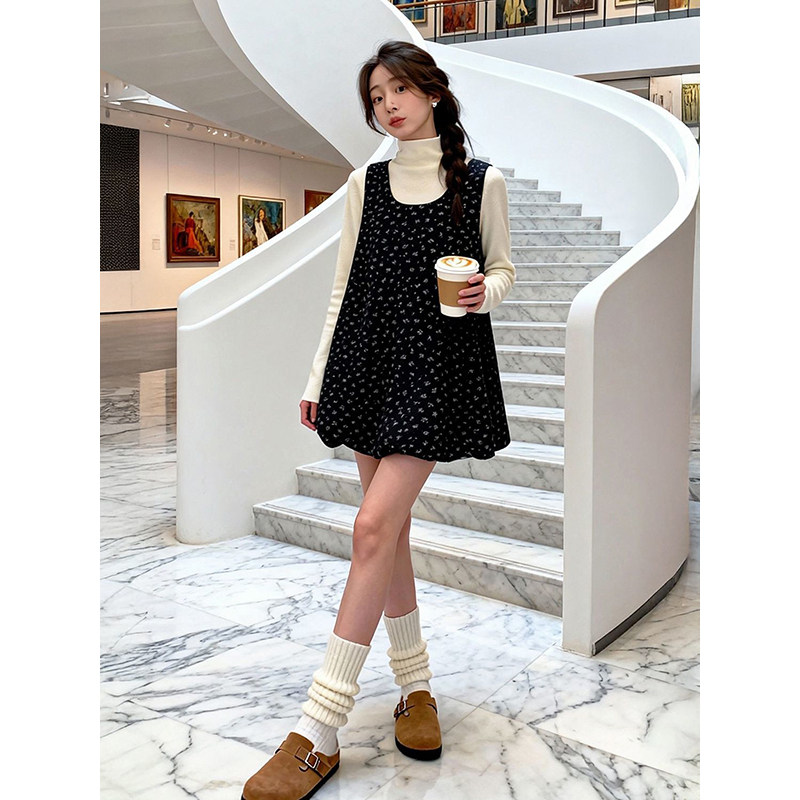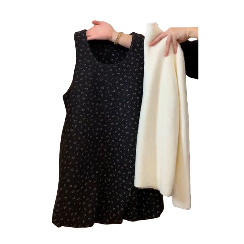 甜美温柔风穿搭一整套U领碎花黑色花苞背心连衣裙+百搭长袖针织衫