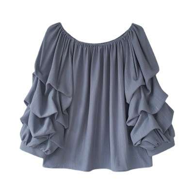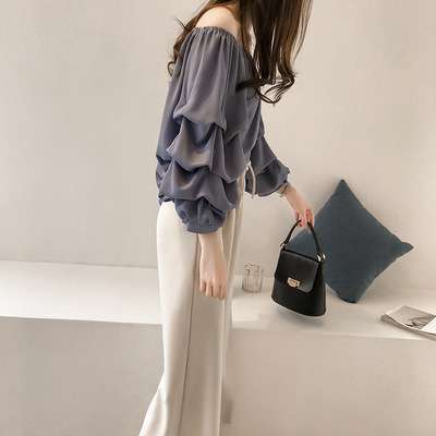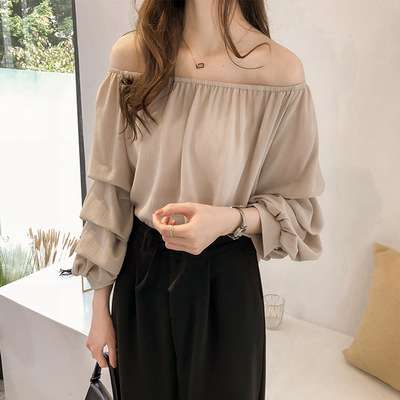 春夏季新款韩版一字领露肩宽松层层雪纺衫飘逸长袖上衣衬衫女