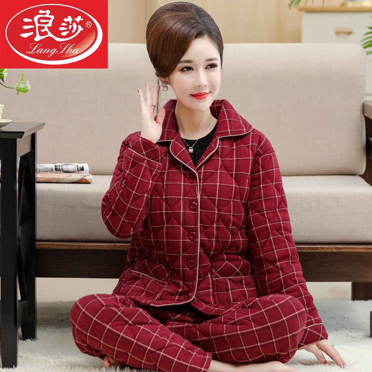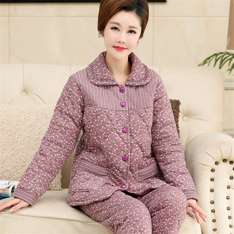 冬季中老年人妈妈睡衣女纯棉加厚三层夹棉袄秋冬加棉保暖全棉套装