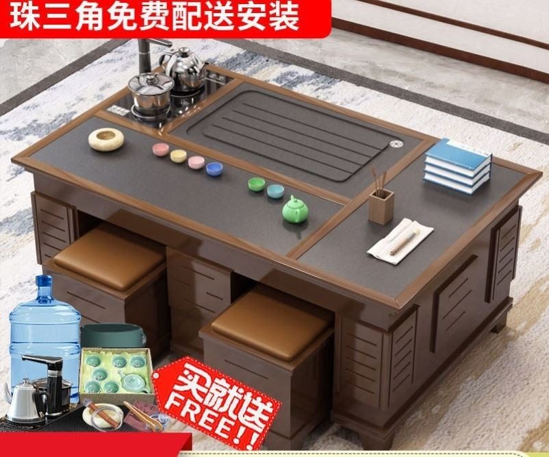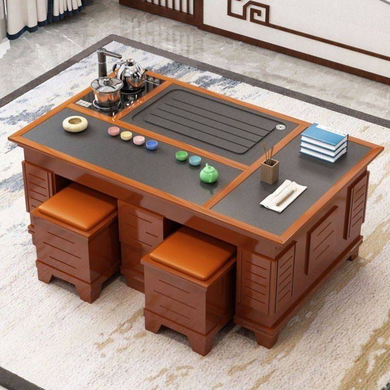 火烧石功夫茶几多功能桌岩板电视柜中式一体客厅办公室实木泡茶台