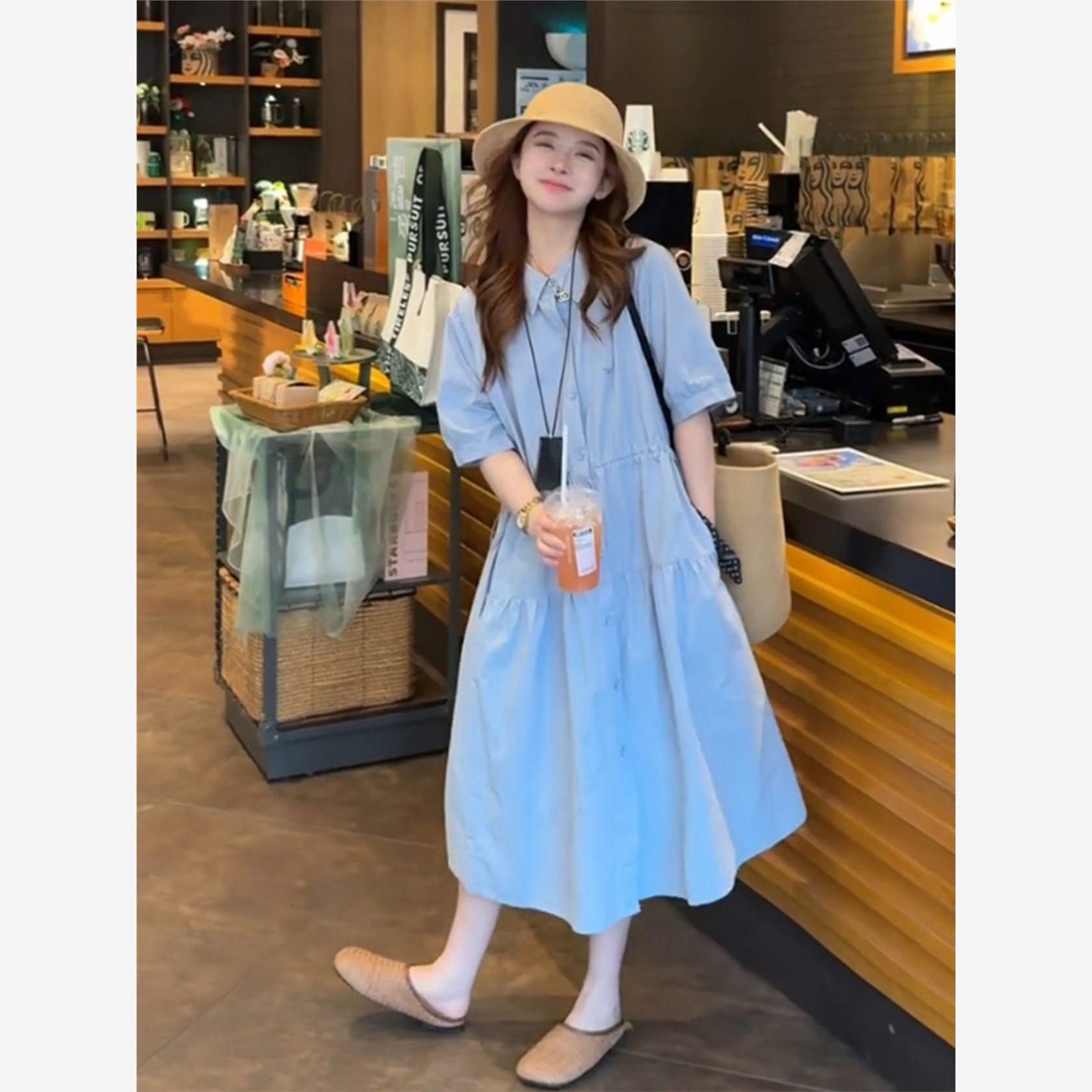 法式温柔风蓝色泡泡袖衬衫连衣裙女早秋高级感海边度假收腰长裙子