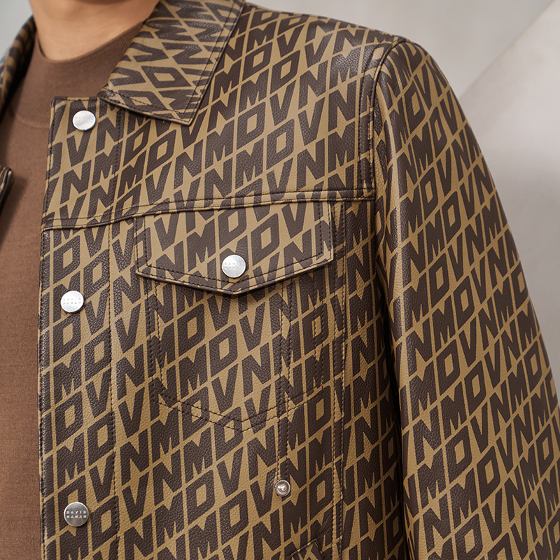 DAVID NAMAN25新品男士满印字母老花翻领皮衣复古棕色真皮皮衣