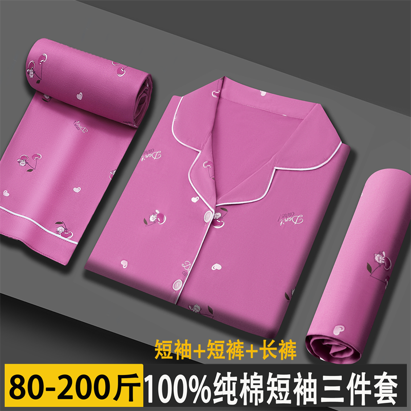 高档100%纯棉睡衣女士夏季薄款短袖全棉家居服女式开衫三件套装