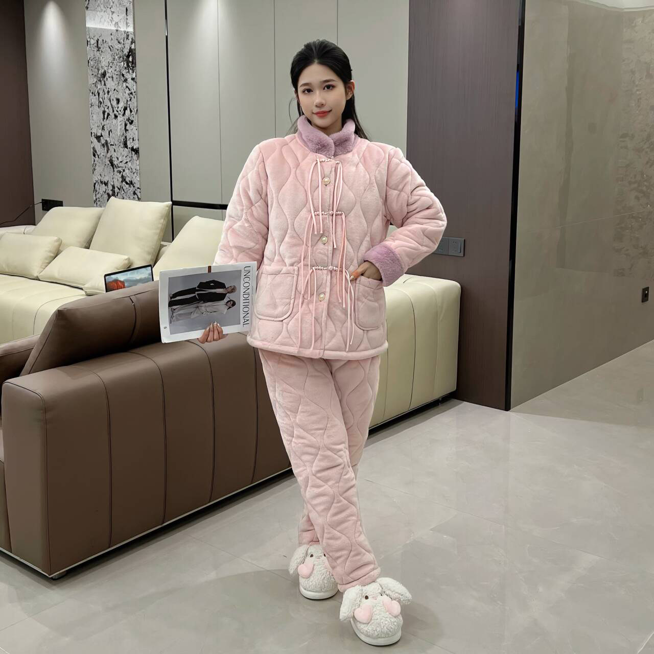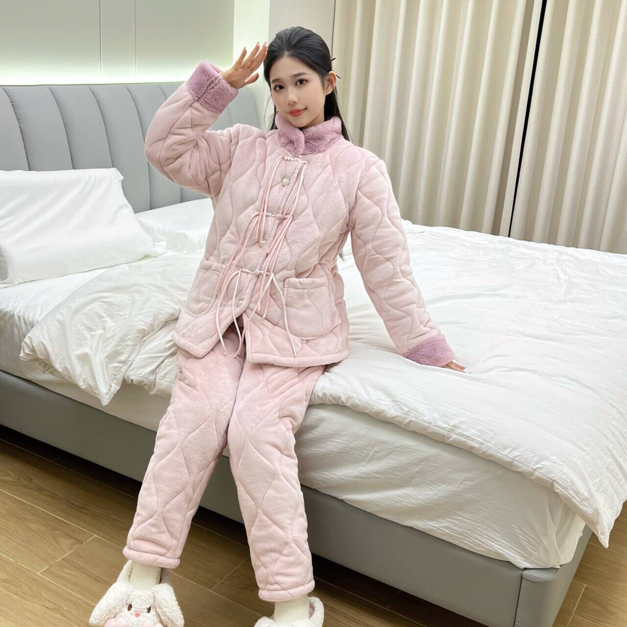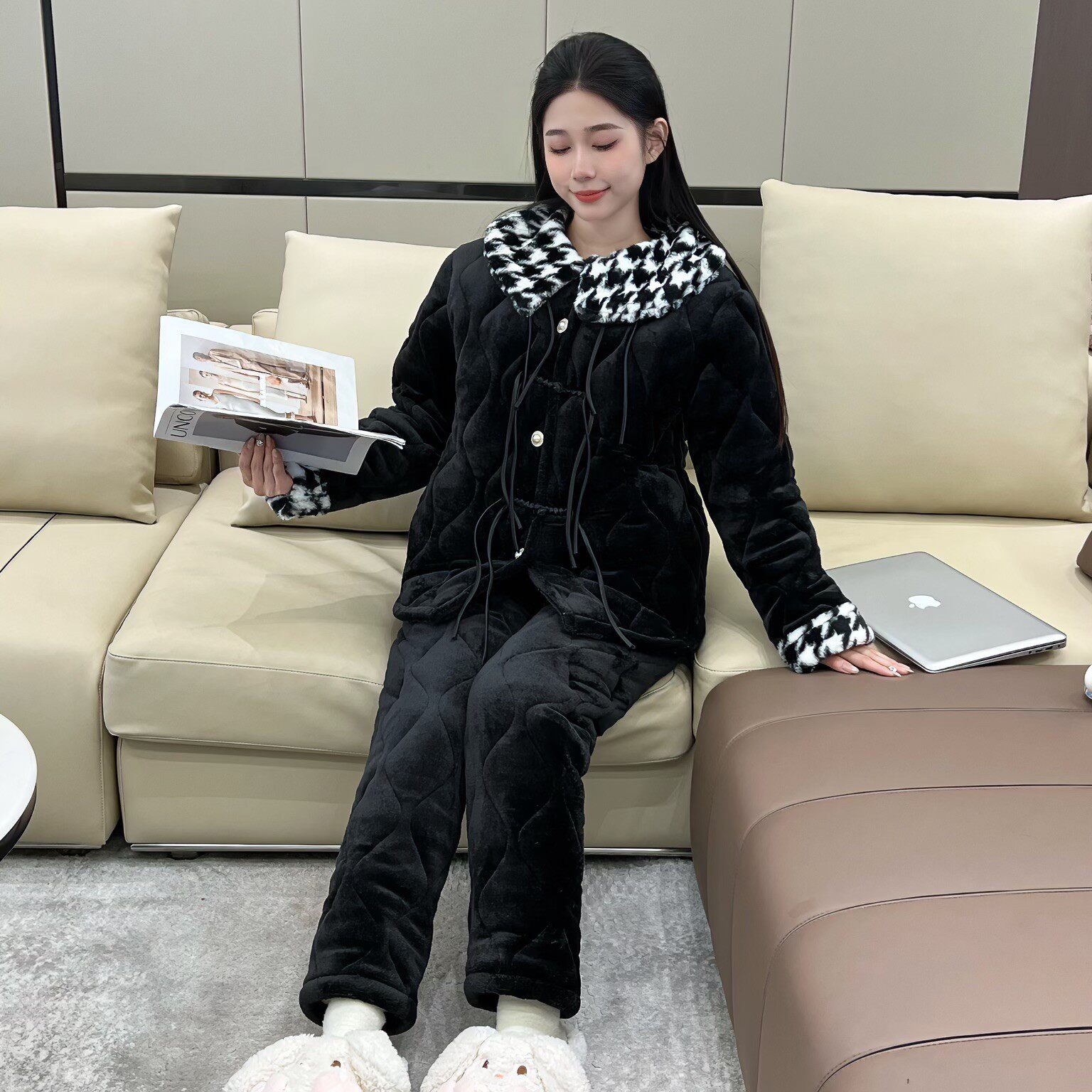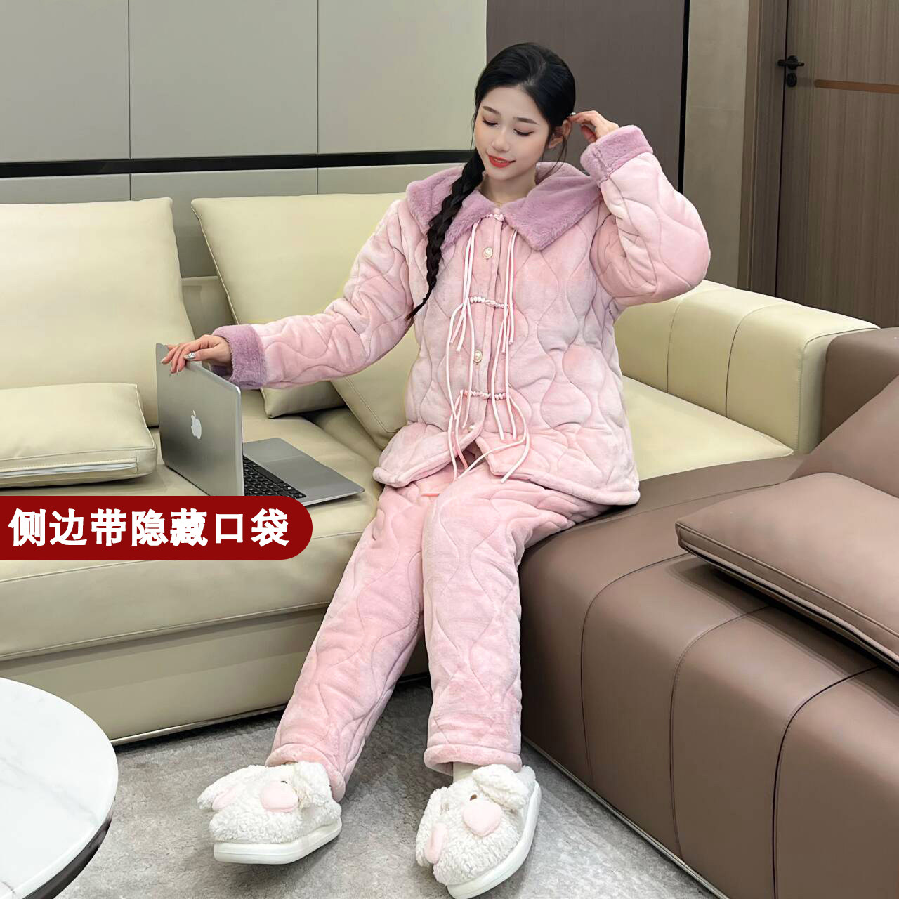 睡衣女2024新款冬季珊瑚绒三层夹棉加厚加绒保暖家居服套装