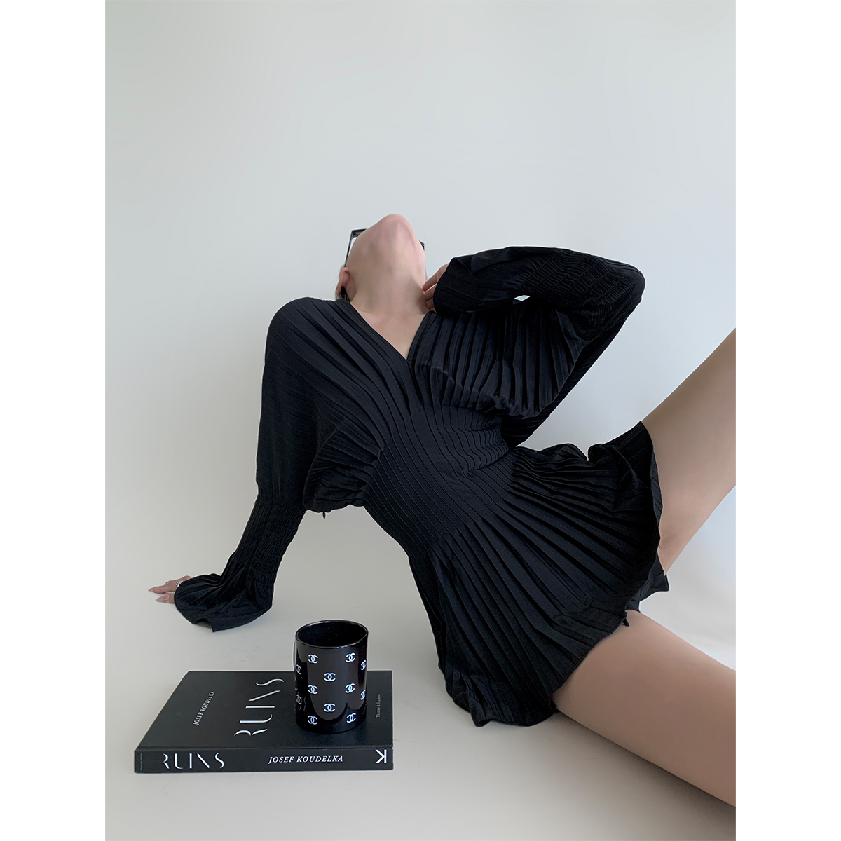 PAPERLLL辛间 玉兰风琴 法式V领收腰衬衫女喇叭袖压褶短款连衣裙