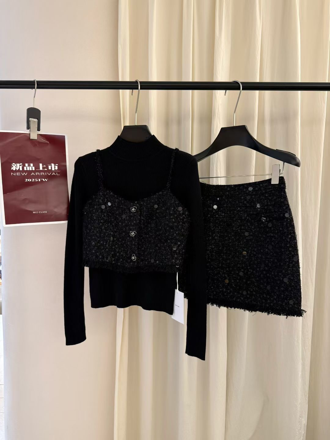【现货】欧货25秋冬法式针织衫亮片吊带高腰半裙小香风三件套装