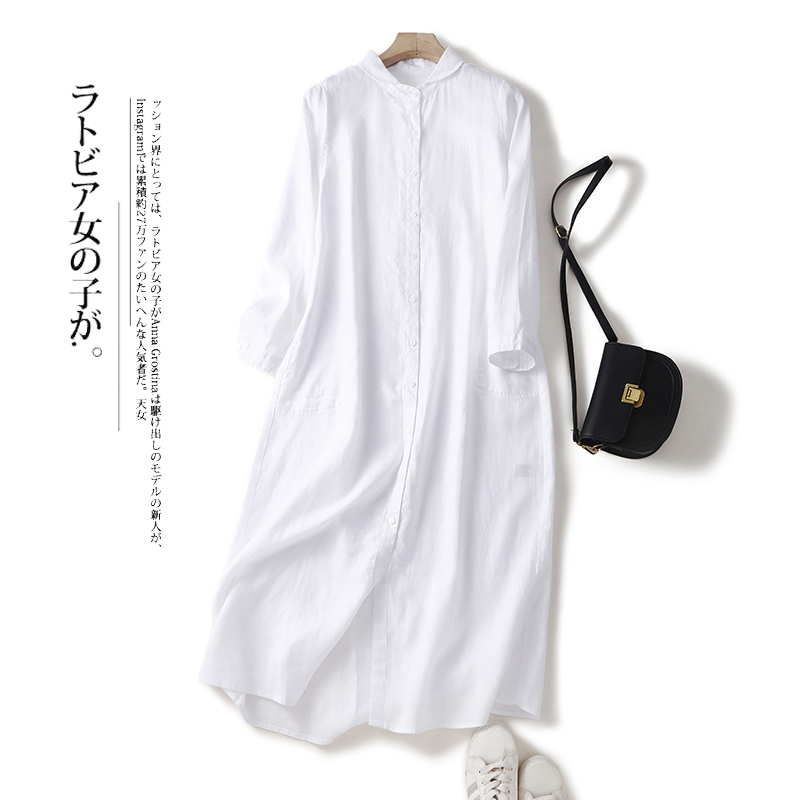 外贸出口大牌日单纯色亚麻衬衫裙女宽松休闲中长款开衫气质连衣裙