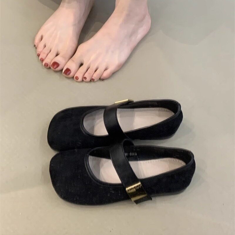 复古玛丽珍鞋2025新款韩系气质优雅绒面金属扣圆头显瘦软底芭蕾鞋