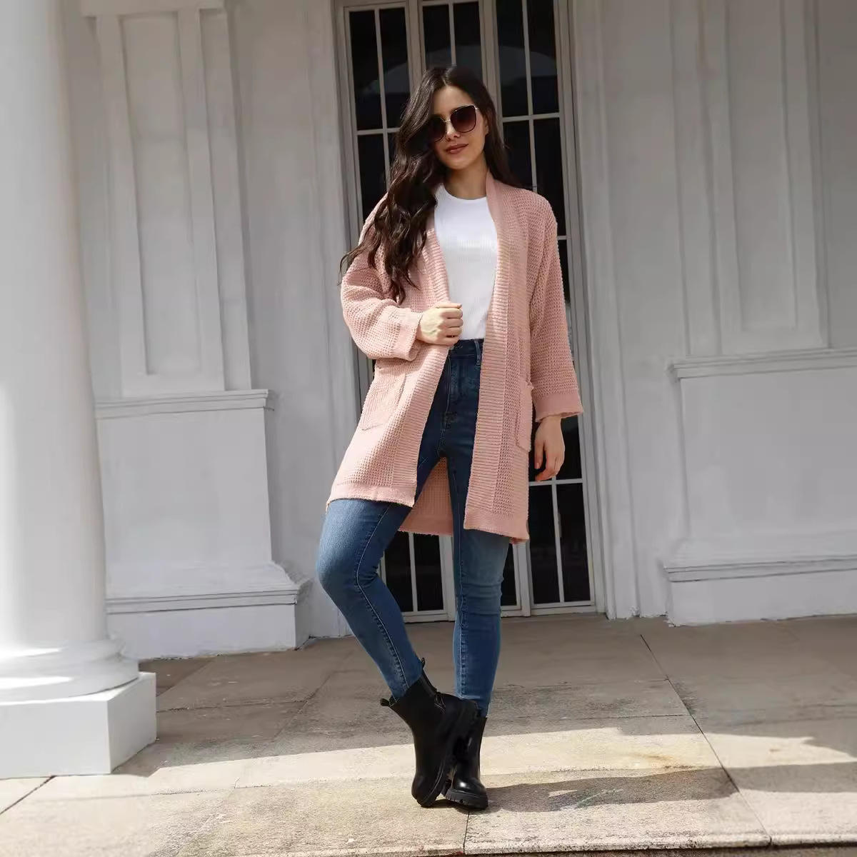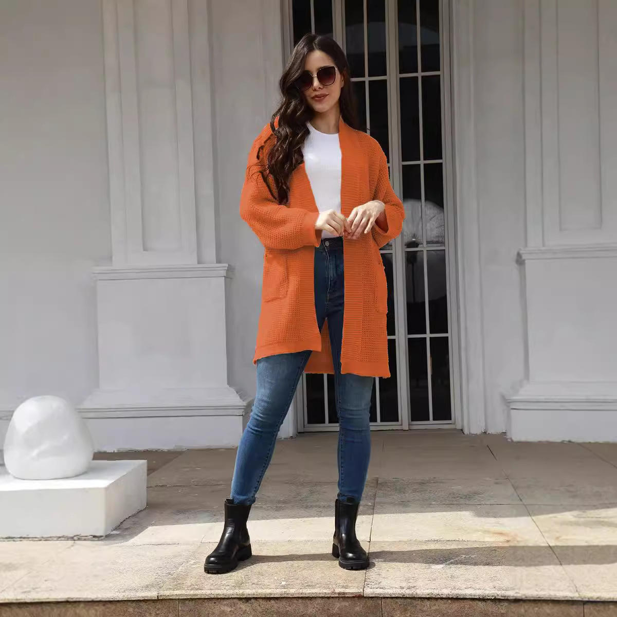 新款欧美外贸针织衫秋冬2025中长款口袋毛衣亚马逊开衫女