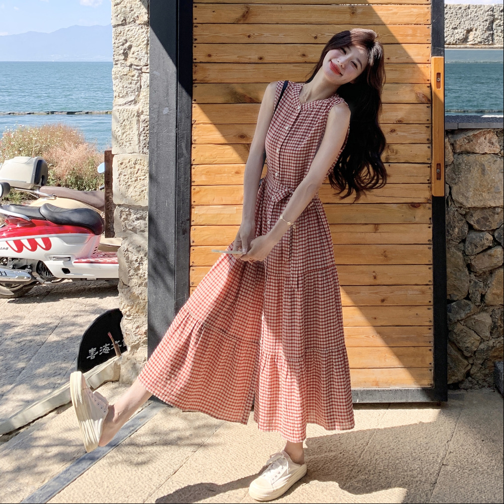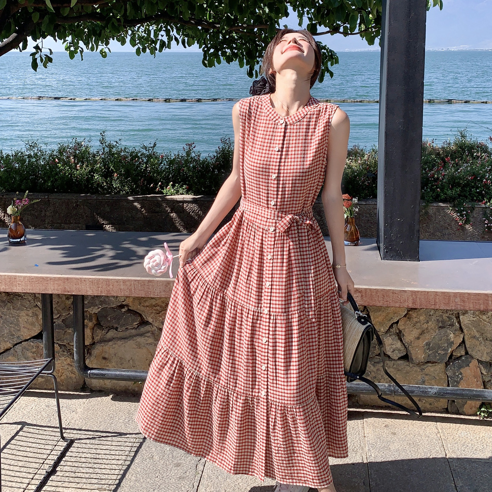 官网女装夏易菲红色格子无袖连衣裙女2025夏季新款法式复古收腰显