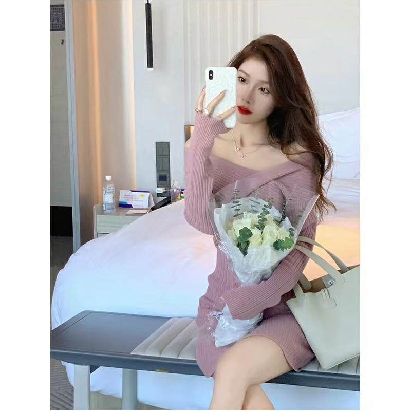 早春季修身粉色v领针织连衣裙女小个子紧身包臀打底毛衣裙子秋冬