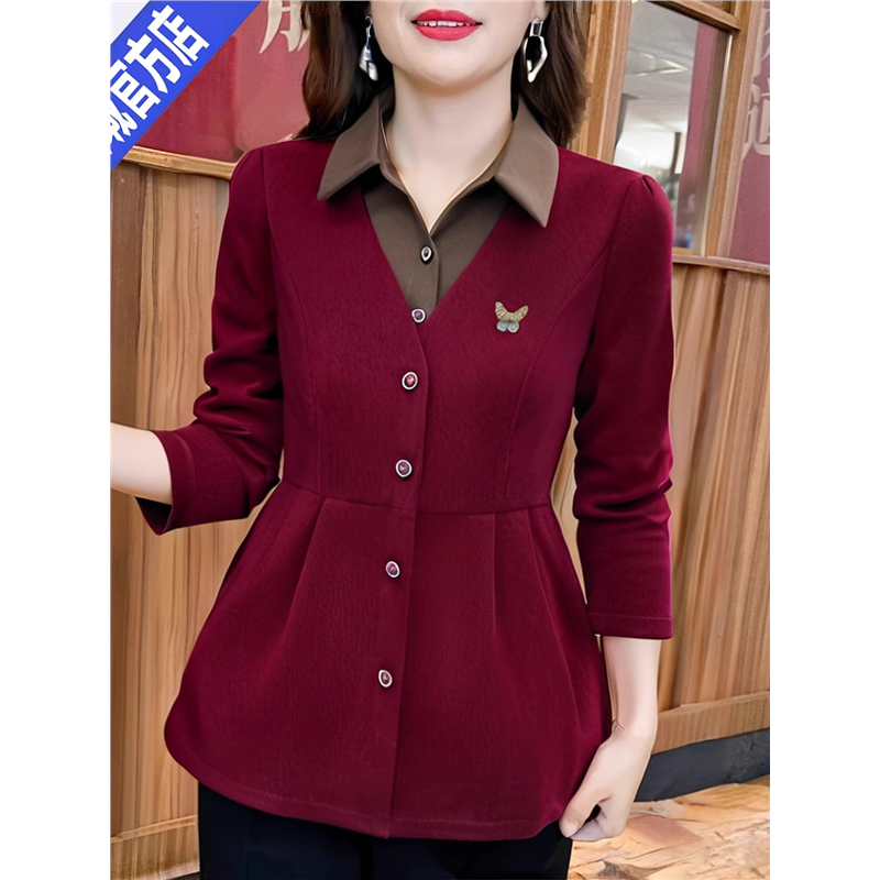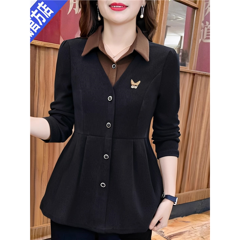 2025春季新款时尚假两件长袖衬衫中年妈妈装女宽松翻领中长款上衣