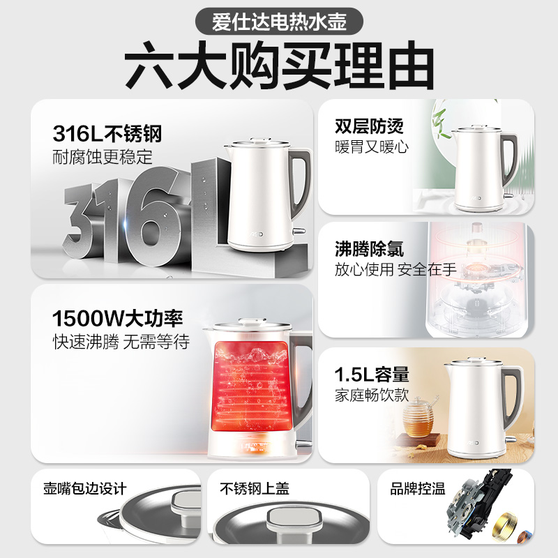 爱仕达电热水壶316L不锈钢家用烧水壶开水壶官方旗舰店正品 除氯