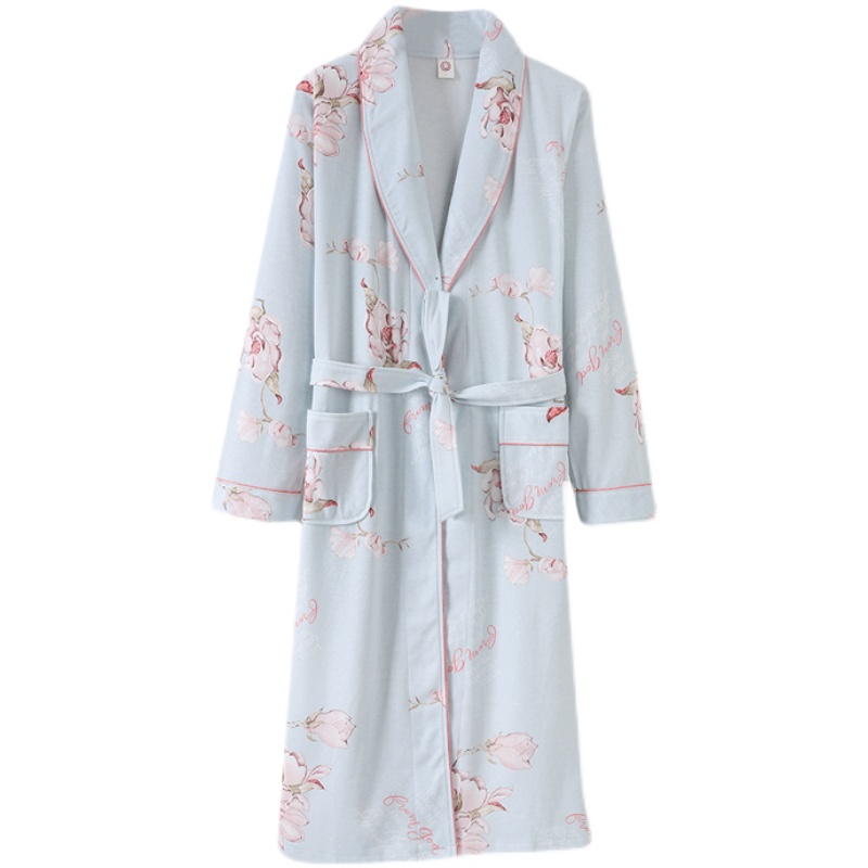 女士纯棉长袖睡袍春秋季大码宽松浴衣中长款过膝浴袍家居服可外穿