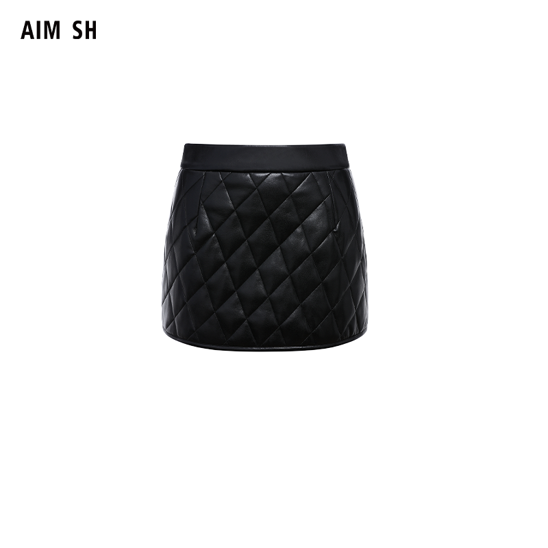 AIM SH 女士 黑色夹棉柔软菱格皮裙包臀显瘦短裙