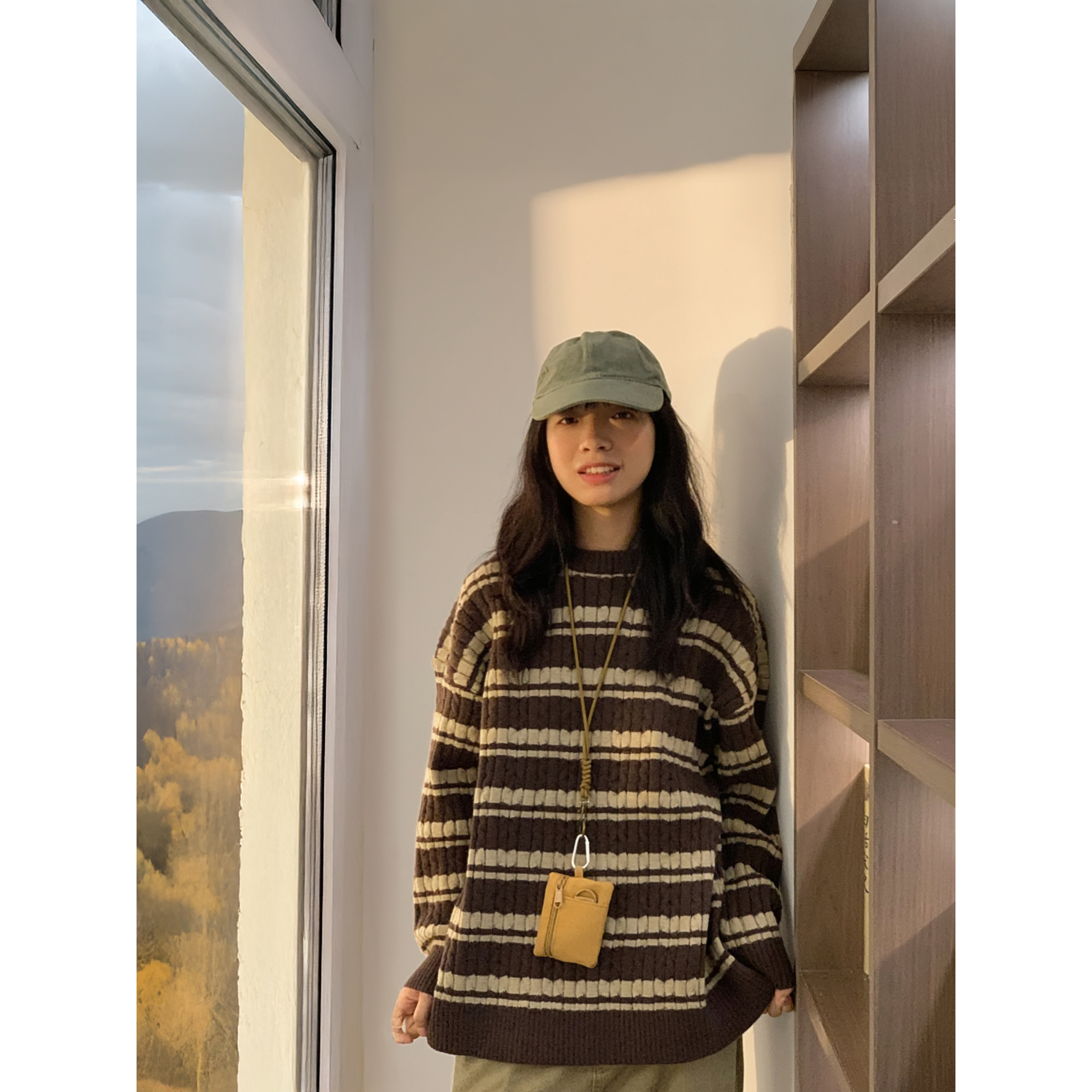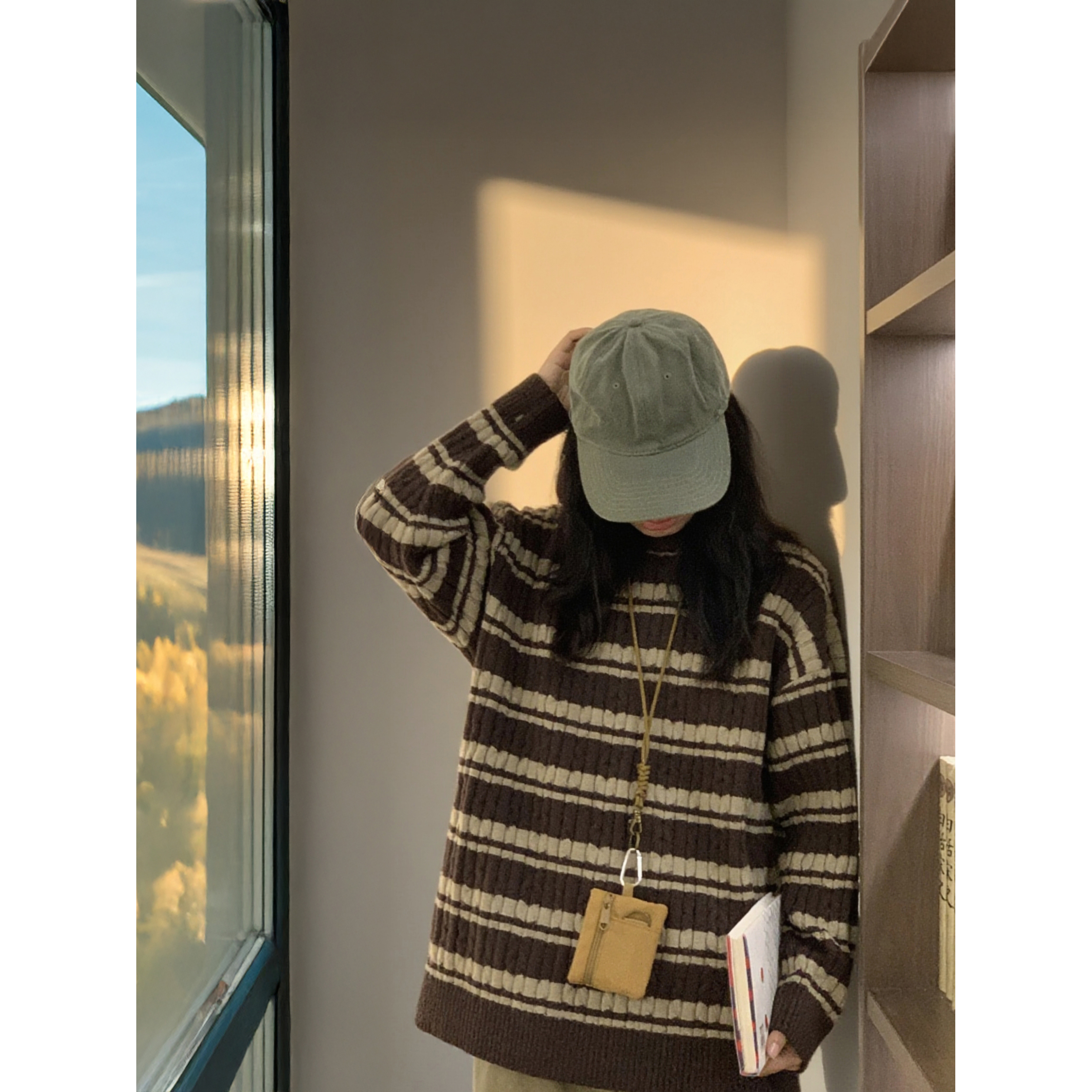 日系复古条纹毛衣男女宽松百搭秋冬休闲慵懒风ins打底撞色针织衫