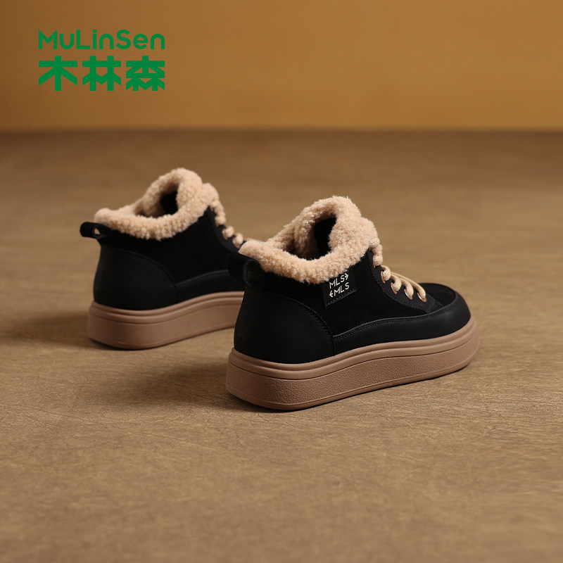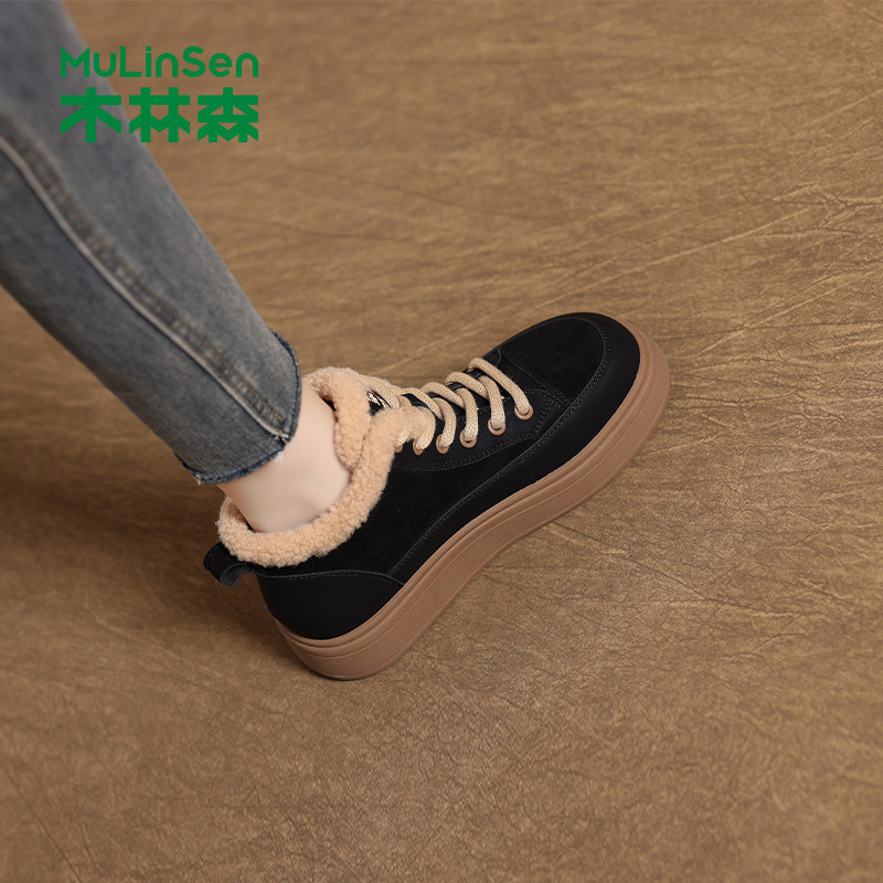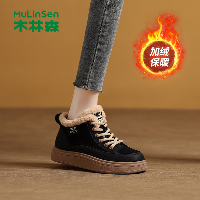 木林森女鞋2025秋冬季新款加绒保暖复古高帮鞋女士防滑舒适休闲鞋