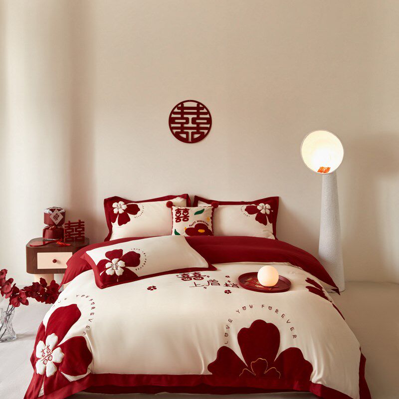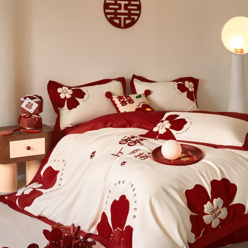 中式婚庆四件套大红色床单被罩全棉结婚陪嫁婚房床上用品