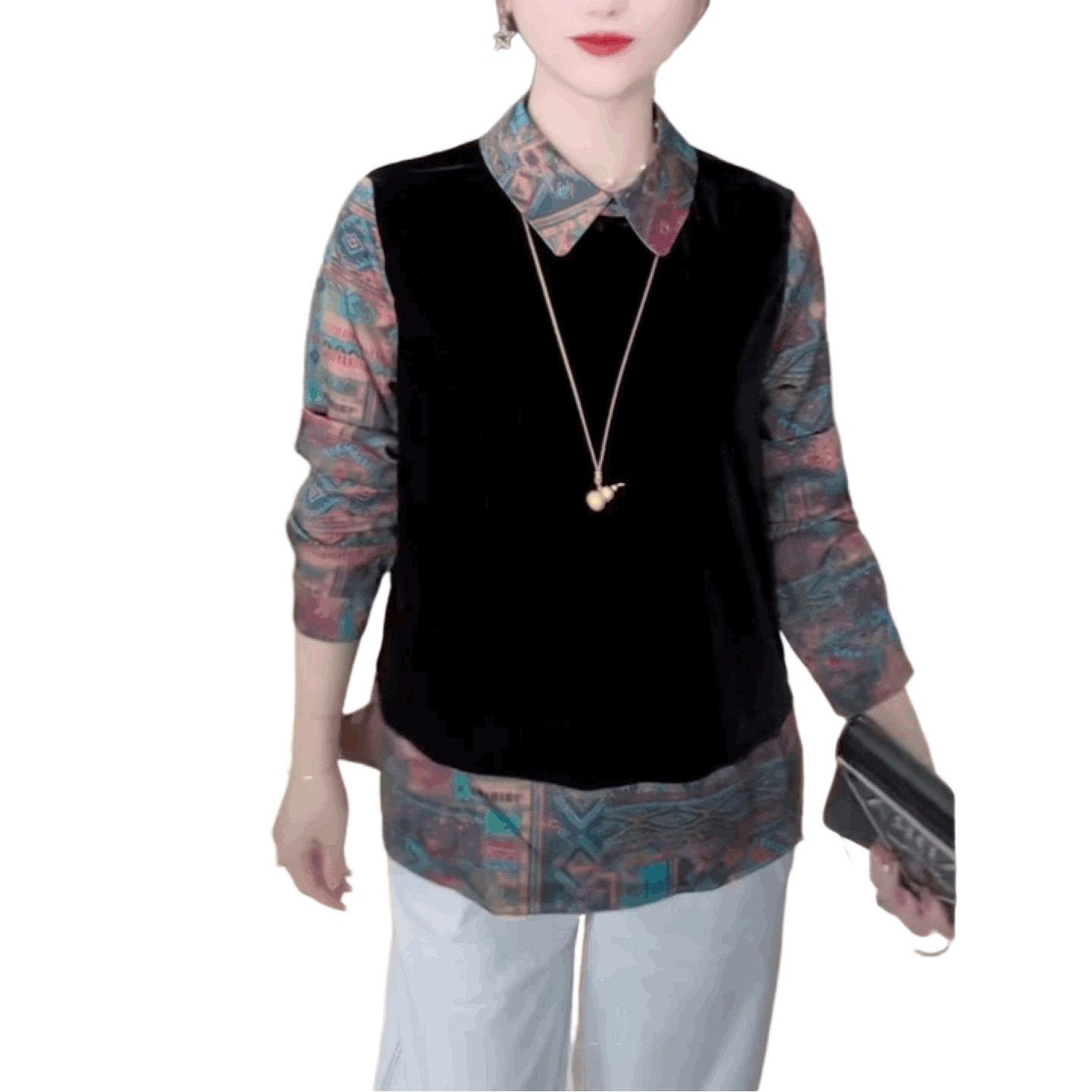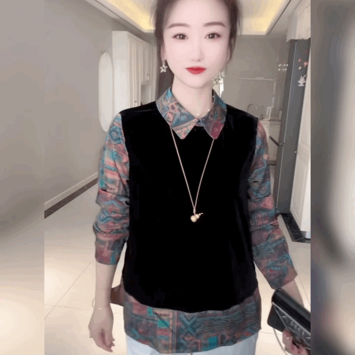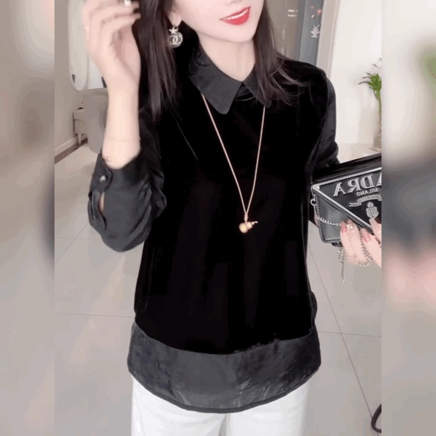 轻奢设计感假两件翻领上衣金丝绒拼雪纺打底衫百搭时尚长袖衬衫女