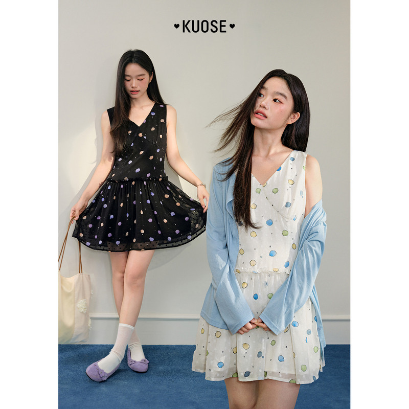 阔色黑色v领无袖雪纺连衣裙女2026春夏季新款木耳边背心短裙子杏