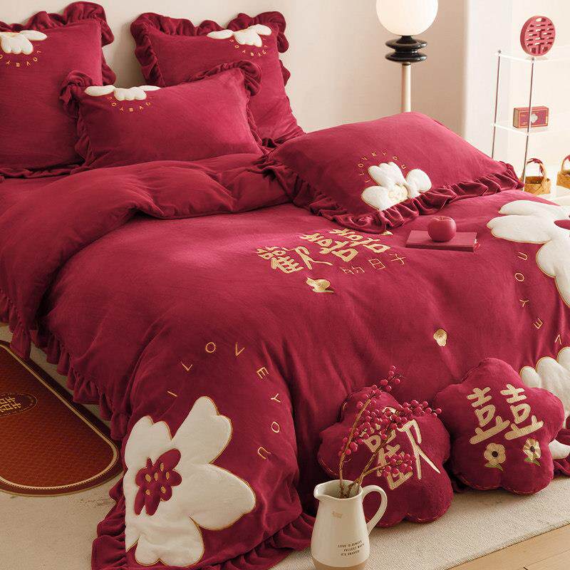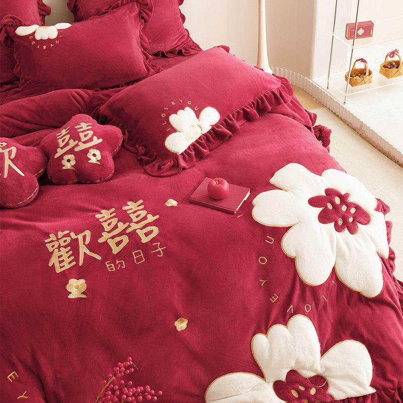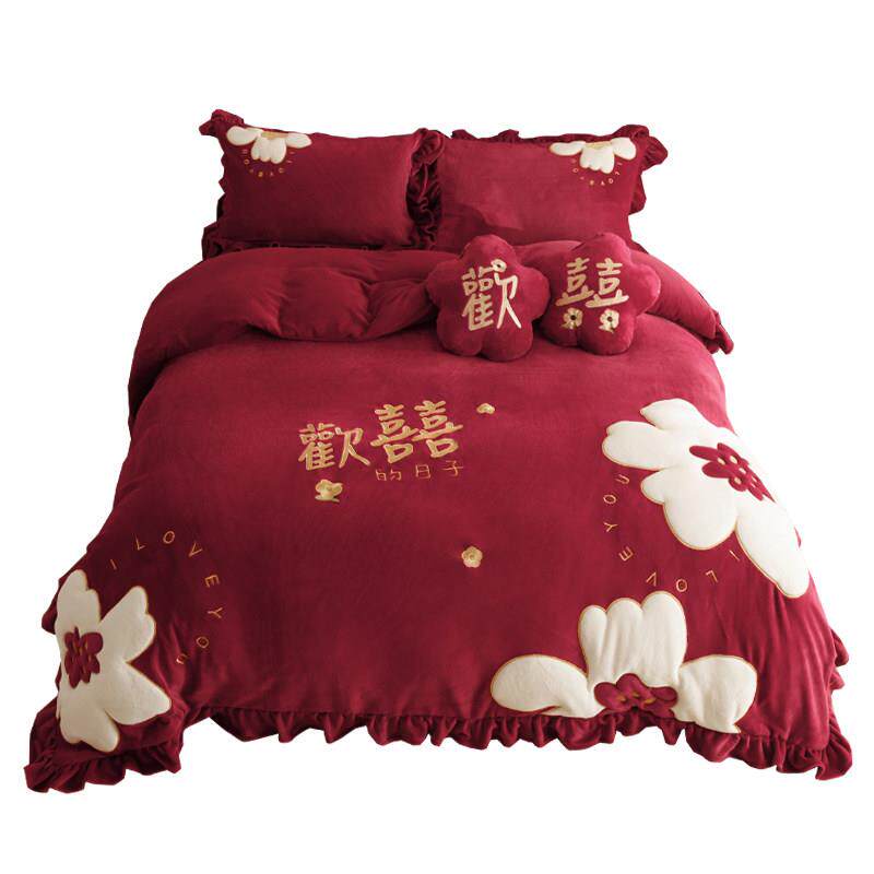 冬天牛奶绒婚庆四件组加厚保暖珊瑚绒欢喜刺绣红色结婚被套床单