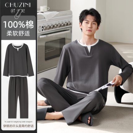 初子尼纯棉长袖睡衣男款男士春秋款2026新款可外穿深灰家居服套装