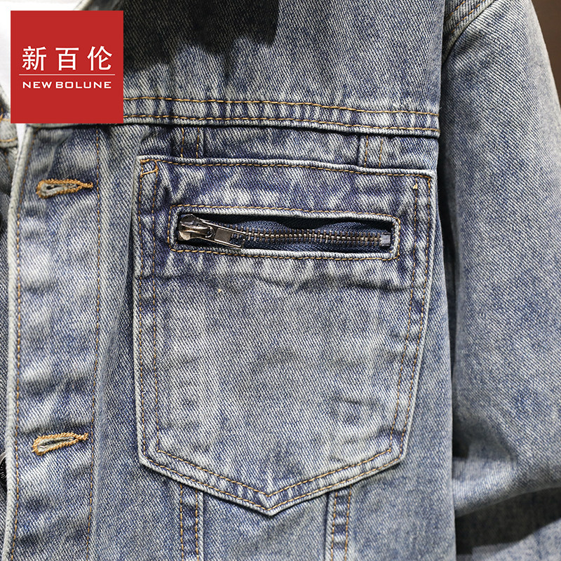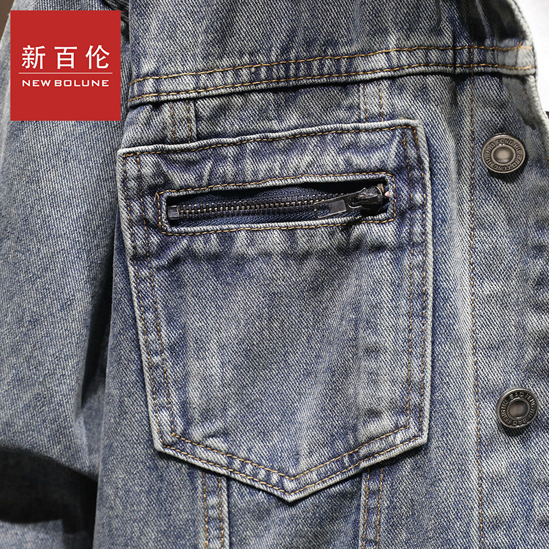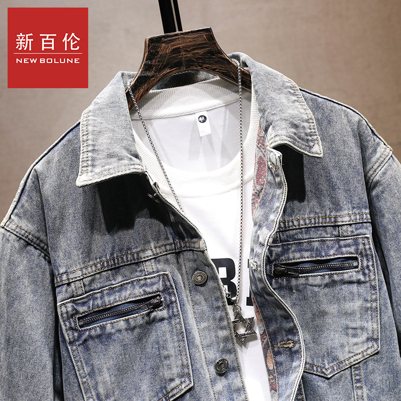 新百伦秋冬季新款男装印花底纯色舒适百搭翻领时尚牛仔外套长袖