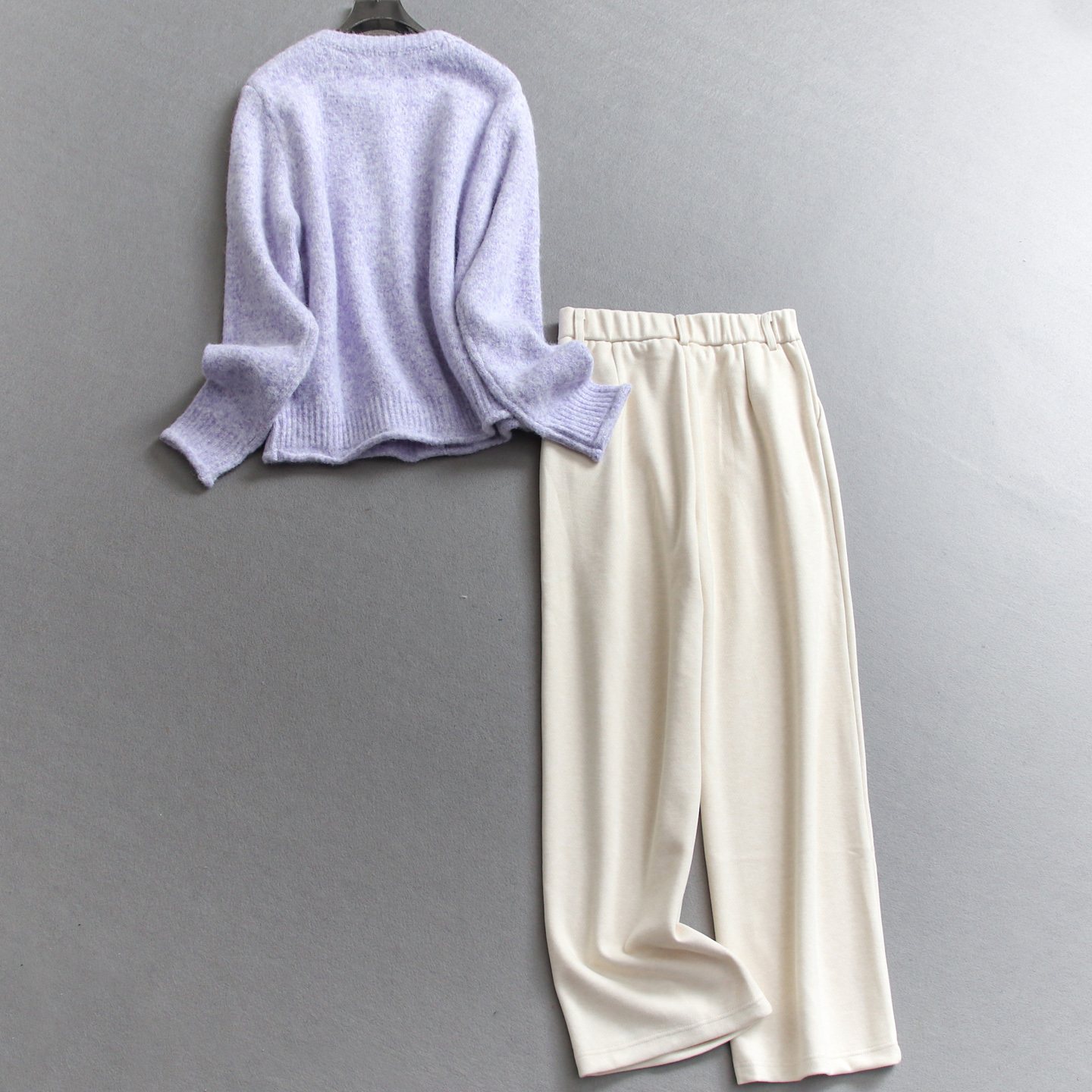 紫色圆领软糯温柔风长袖毛衣可配一整套阔腿休闲裤女两件套装M141