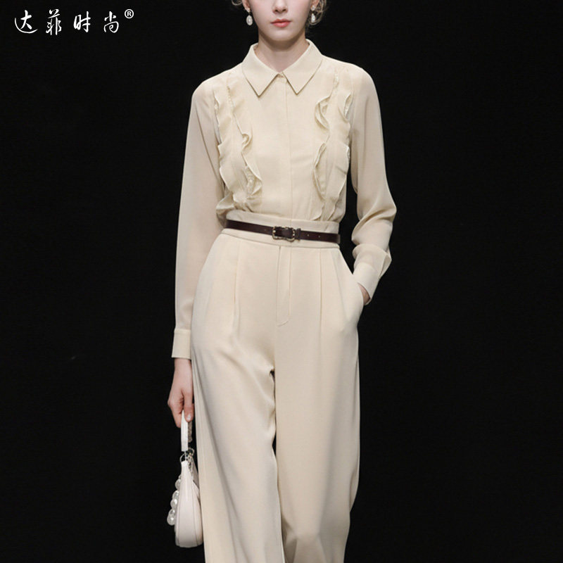2026春季新款气质法式荷叶边设计雪纺衬衣+百搭长裤阔腿裤套装女