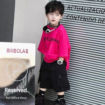 男童夏装套装短袖T恤2025新款中小童帅气时髦半袖火龙果色上衣潮