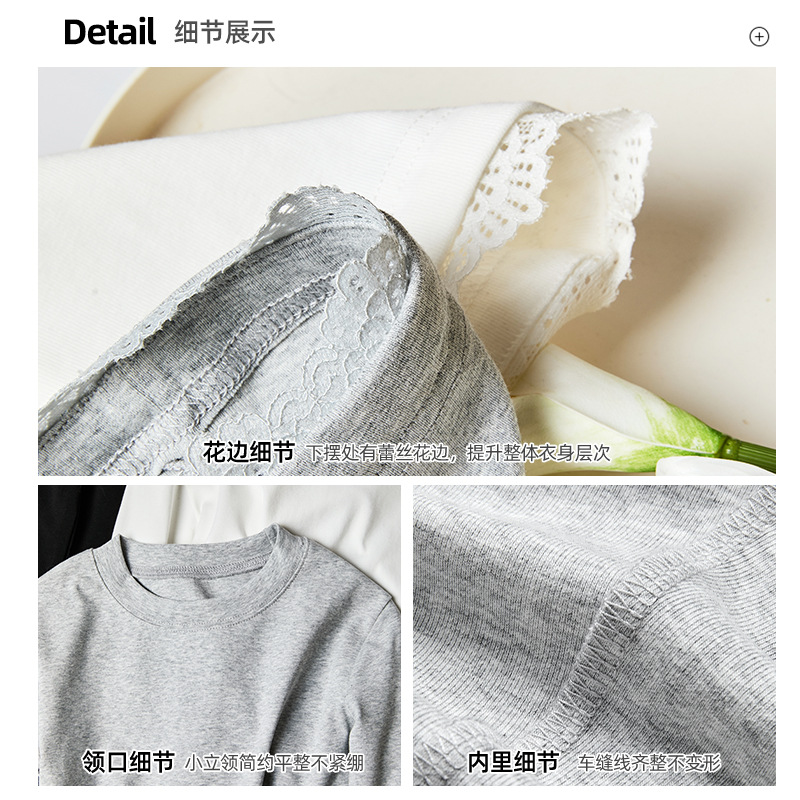 纯棉小圆领长袖正肩t恤女式内搭秋冬季打底衫蕾丝下摆设计感上衣