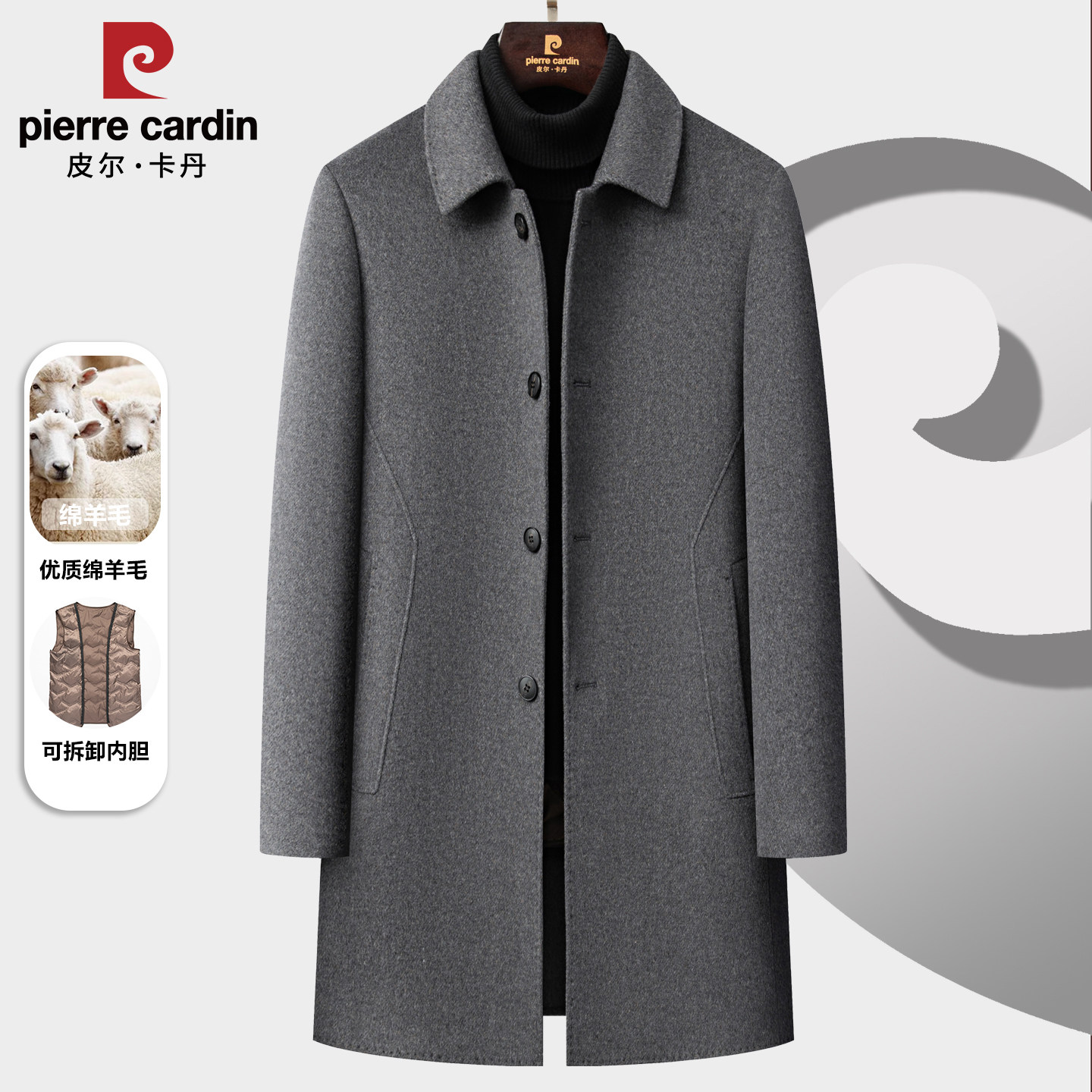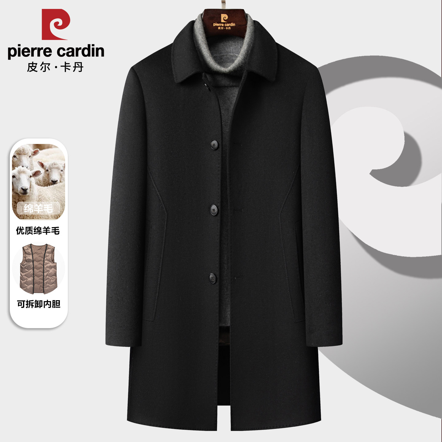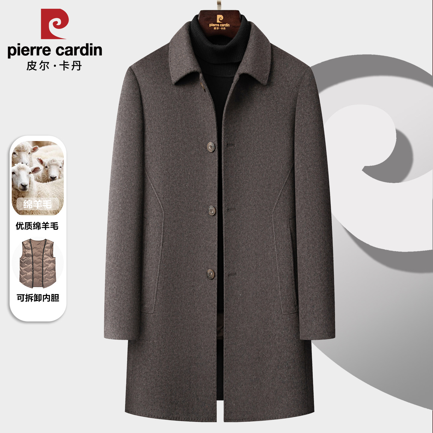 皮尔卡丹中长款羊毛大衣