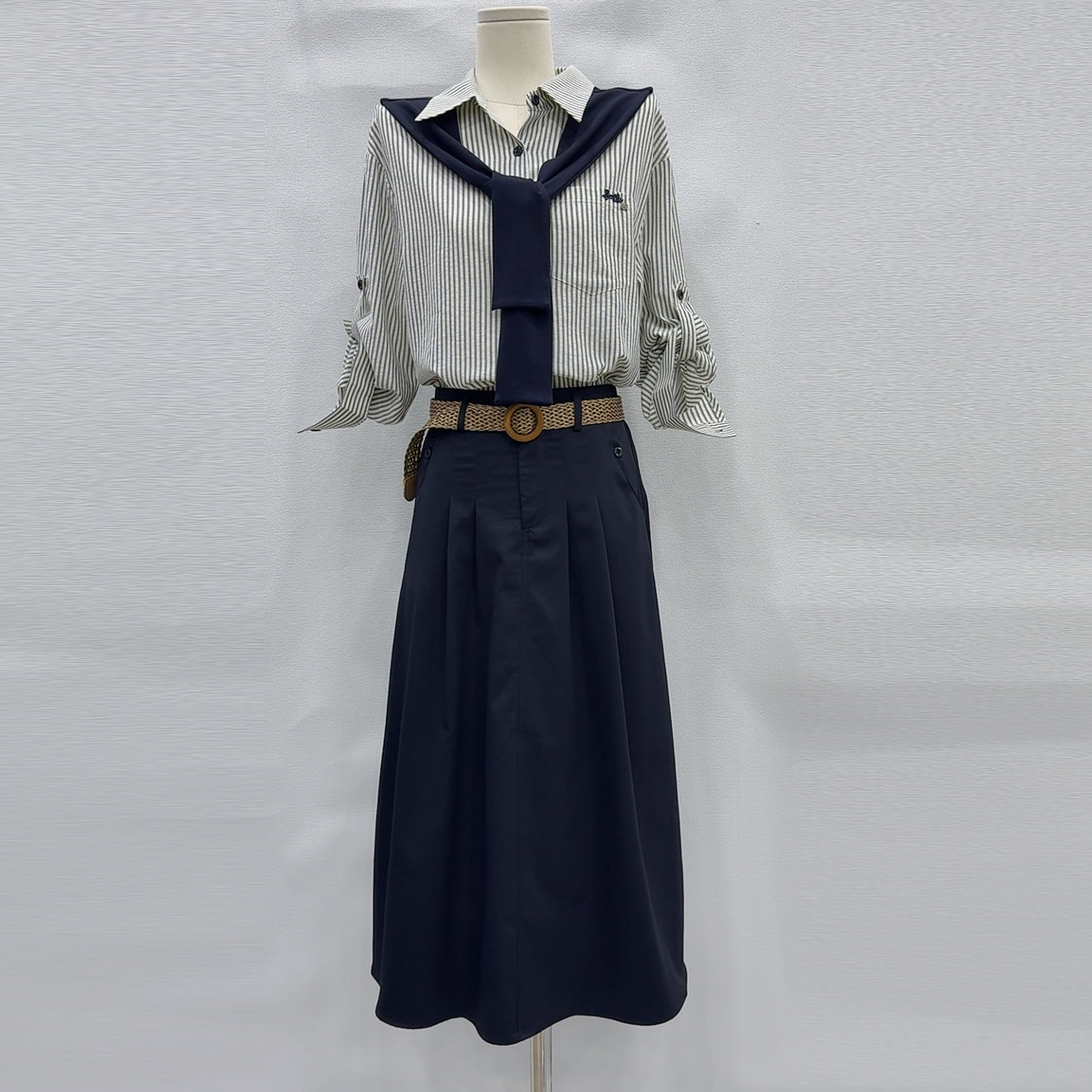 披肩条纹衬衫+半身裙两件套秋季韩系休闲减龄学院风穿搭时尚套装