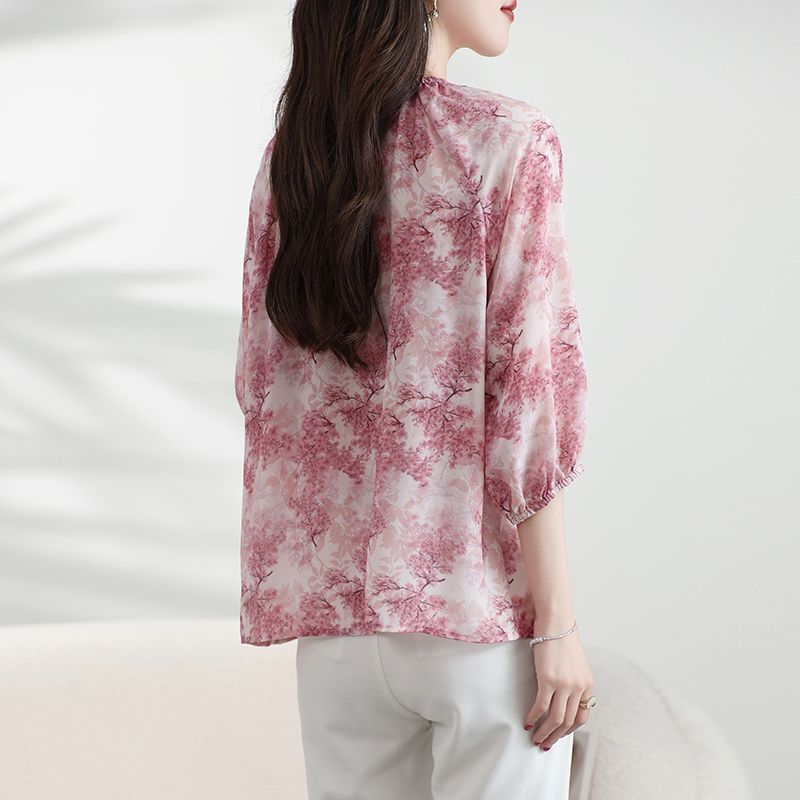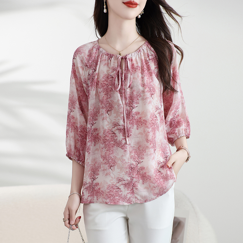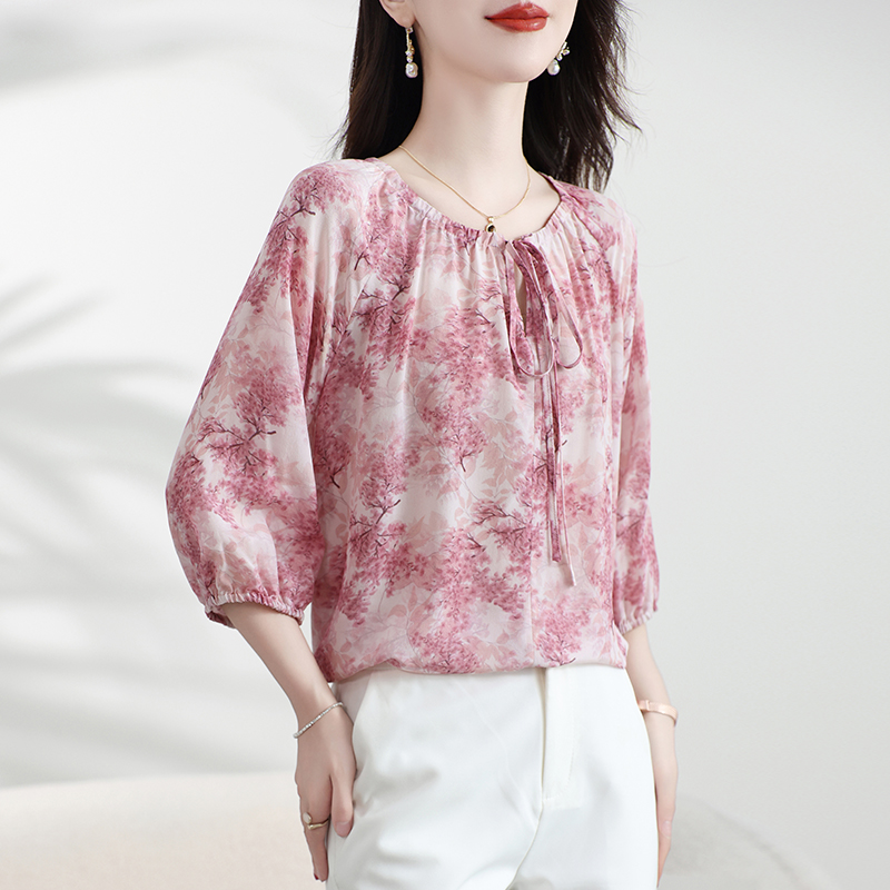 新款高级真丝上衣女圆领甜美桑蚕丝印花T恤时尚小衫休闲洋气夏季