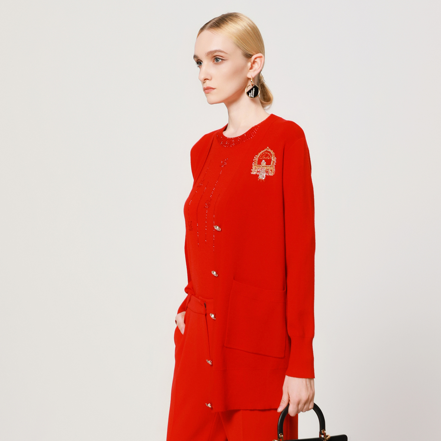 阿丹娜秋季新款女红色绵羊毛混纺针织开衫刺绣外套官方旗舰店正品