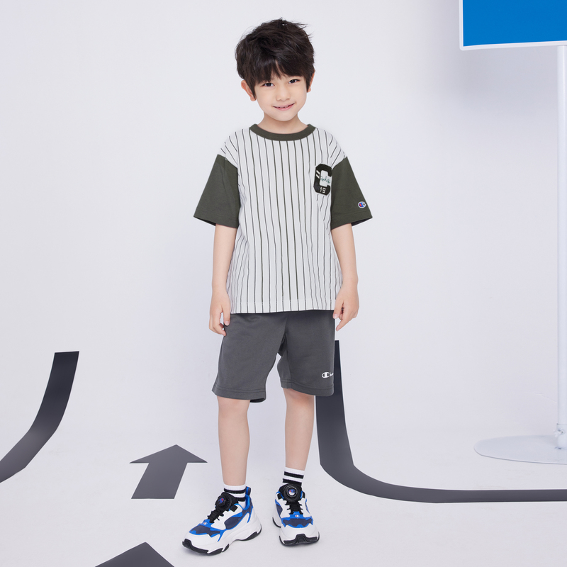 champion冠军儿童装25夏季新款男女小童棉针织刺绣条纹短袖T恤潮