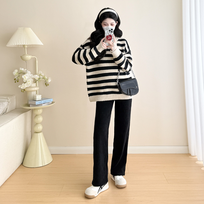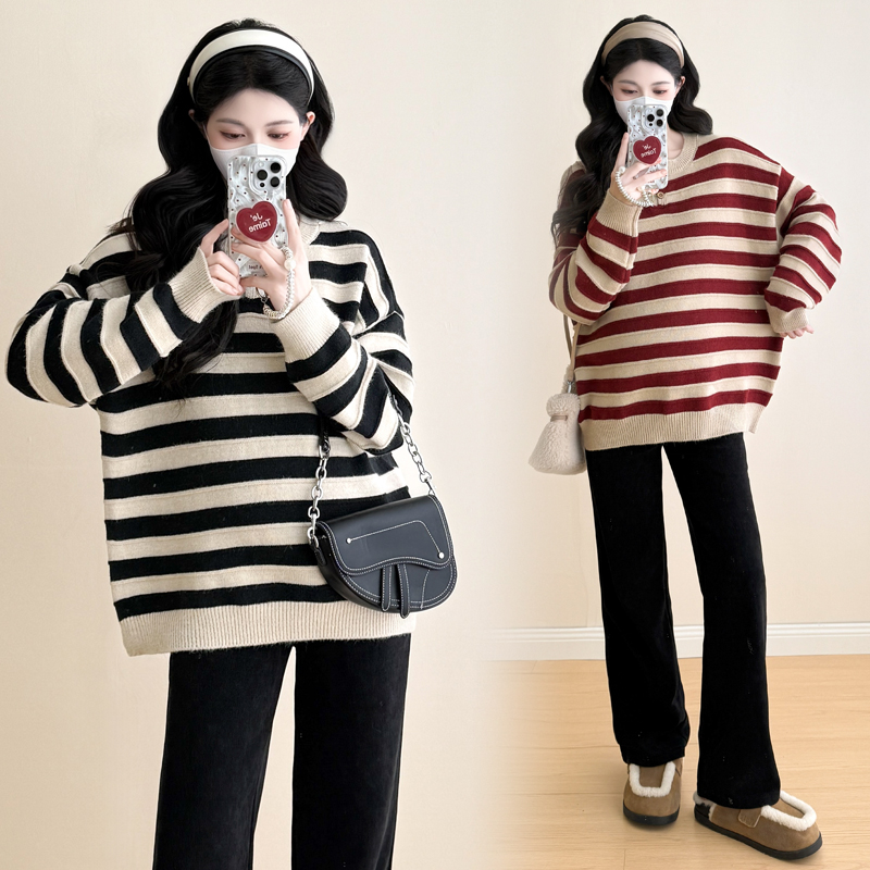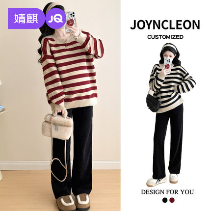 婧麒孕妇套装秋款2025新款时尚针织条纹毛衣秋冬遮肚两件套女