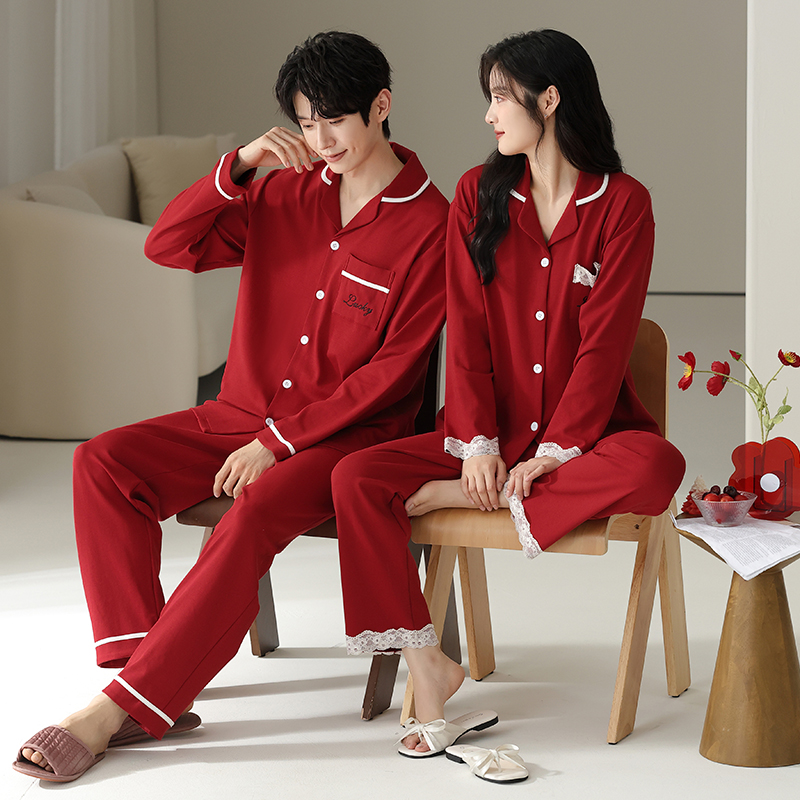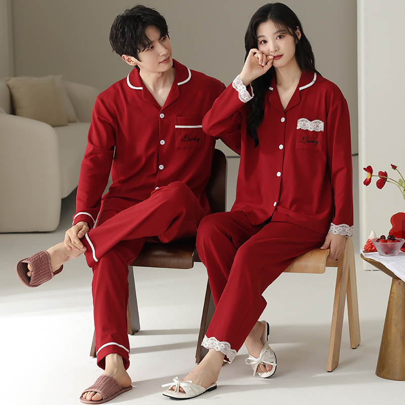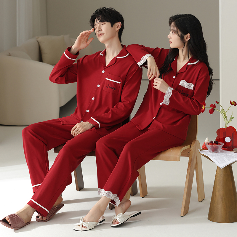 可人儿新款本命年红色睡衣情侣春秋季喜庆纯棉男女结婚家居服套装