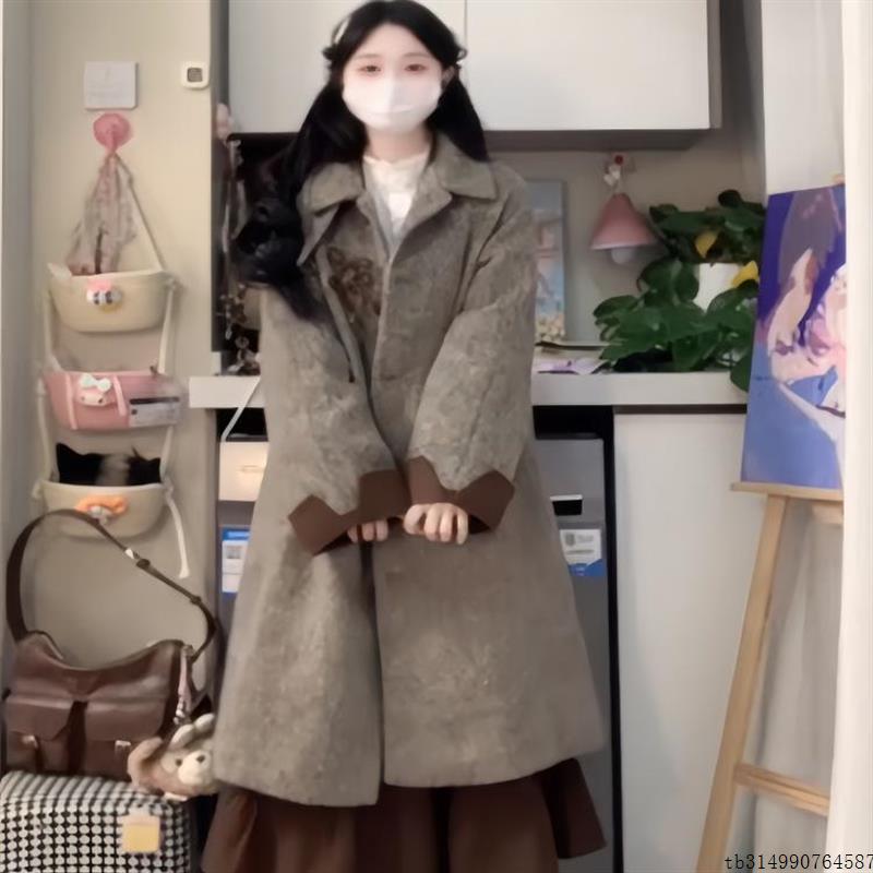 毛呢大衣女款2024新款冬季中长款夹棉加厚复古立领拼接呢子外套潮