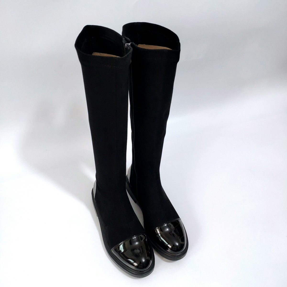 长筒靴厚底大头牛皮拼接骑士靴断码外贸女靴粗跟靴系带马丁高筒靴