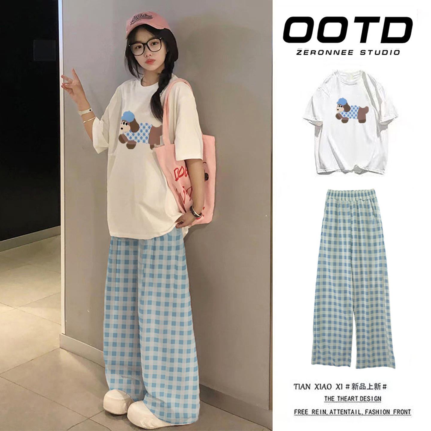 小狗印花短袖t恤女初中生夏套装盐系穿搭蓝色格纹裤子时尚两件套