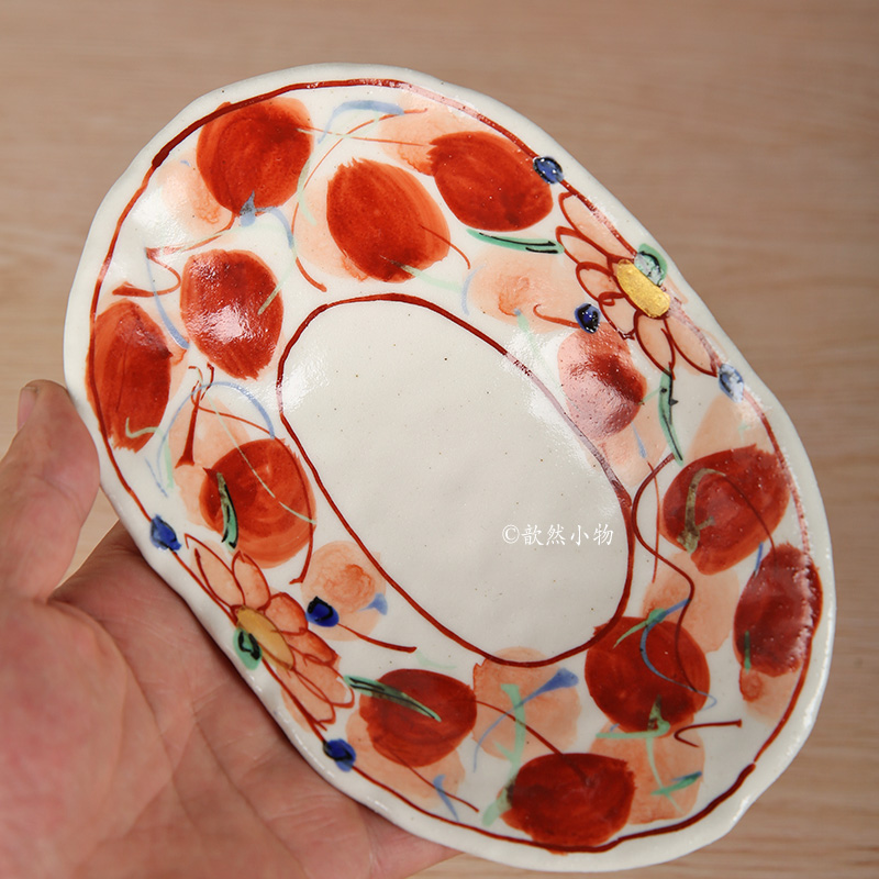 日本制 濑户烧灶师窑KABU手绘樱桃复古椭圆形点心碟茶盘 家用盘子
