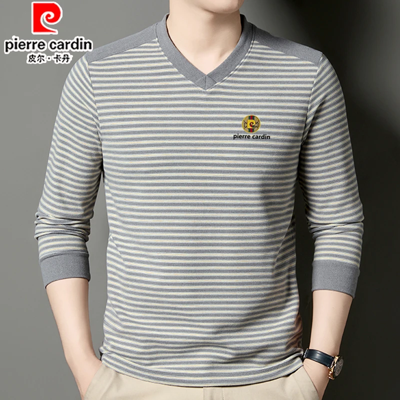 皮尔卡丹男士桑蚕丝羊毛卫衣秋冬季V领条纹长袖T恤双面绒打底衫男
