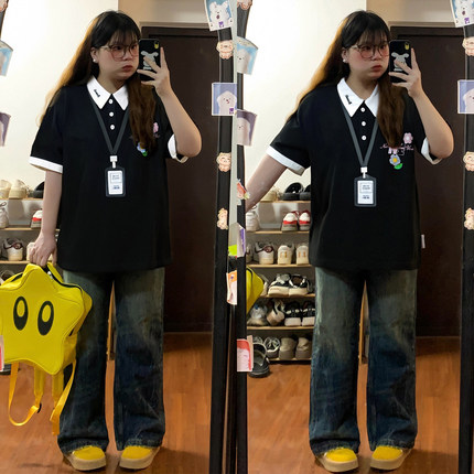 300斤特大码学院风花朵刺绣黑色polo领短袖t恤女胖mm宽松显瘦上衣